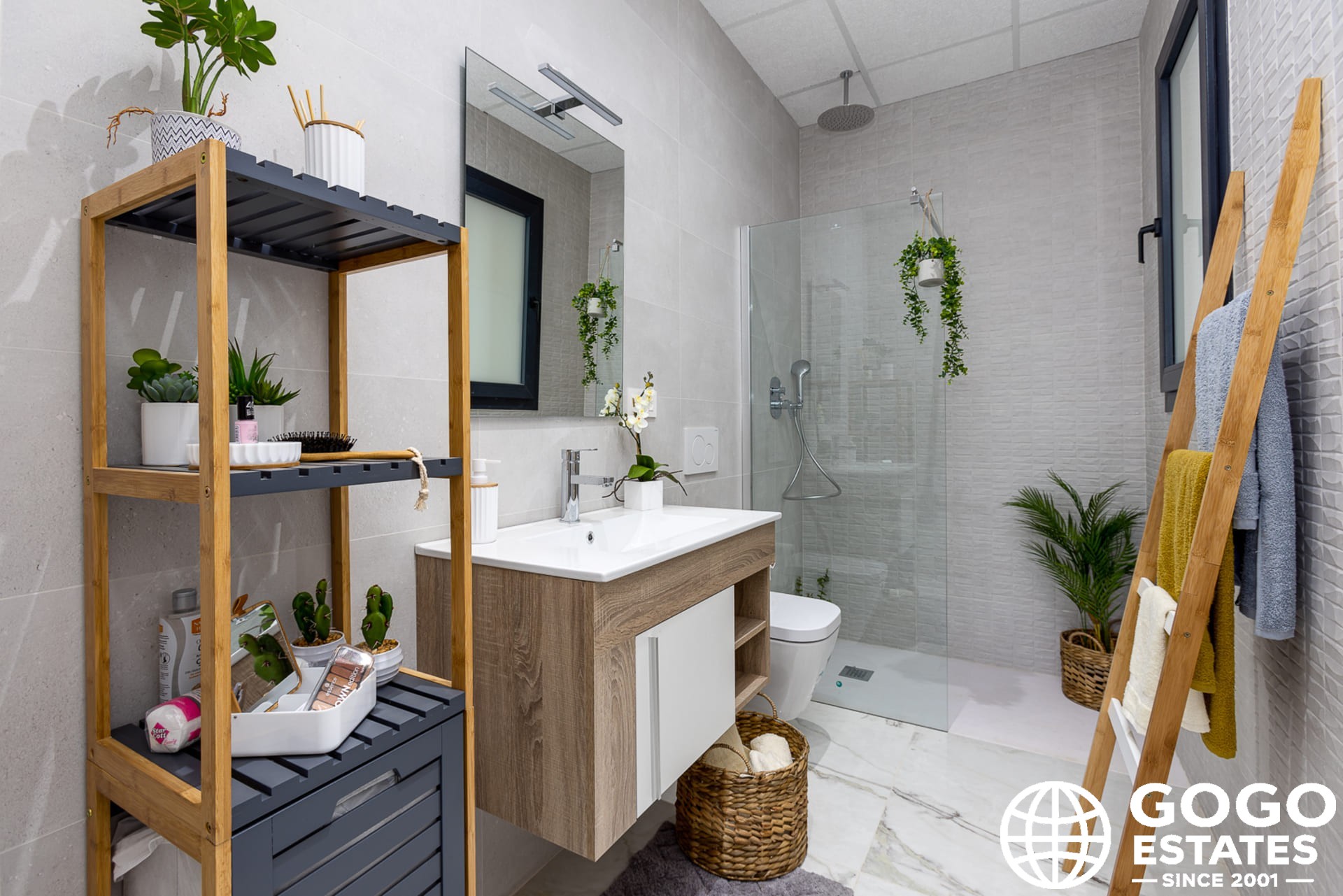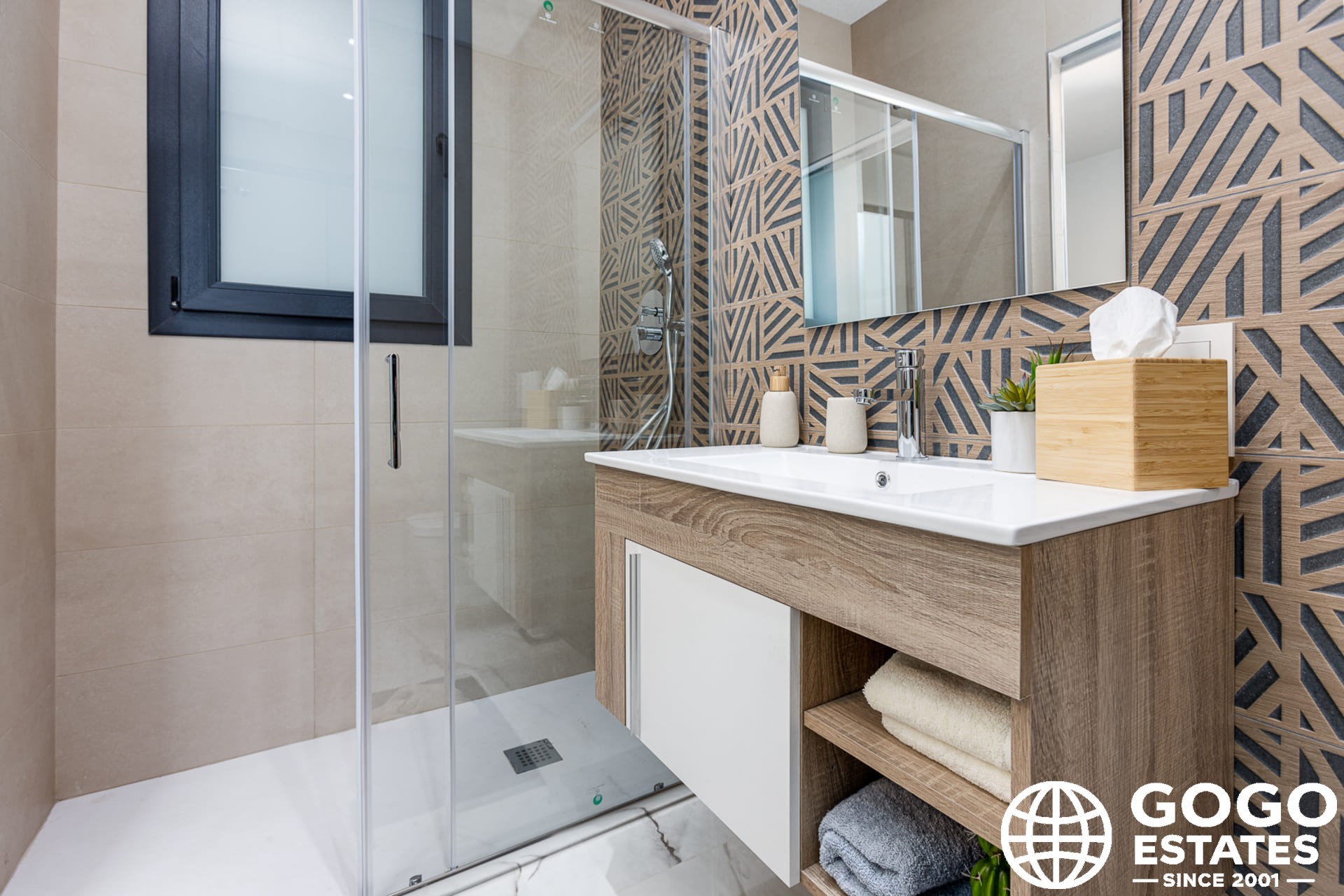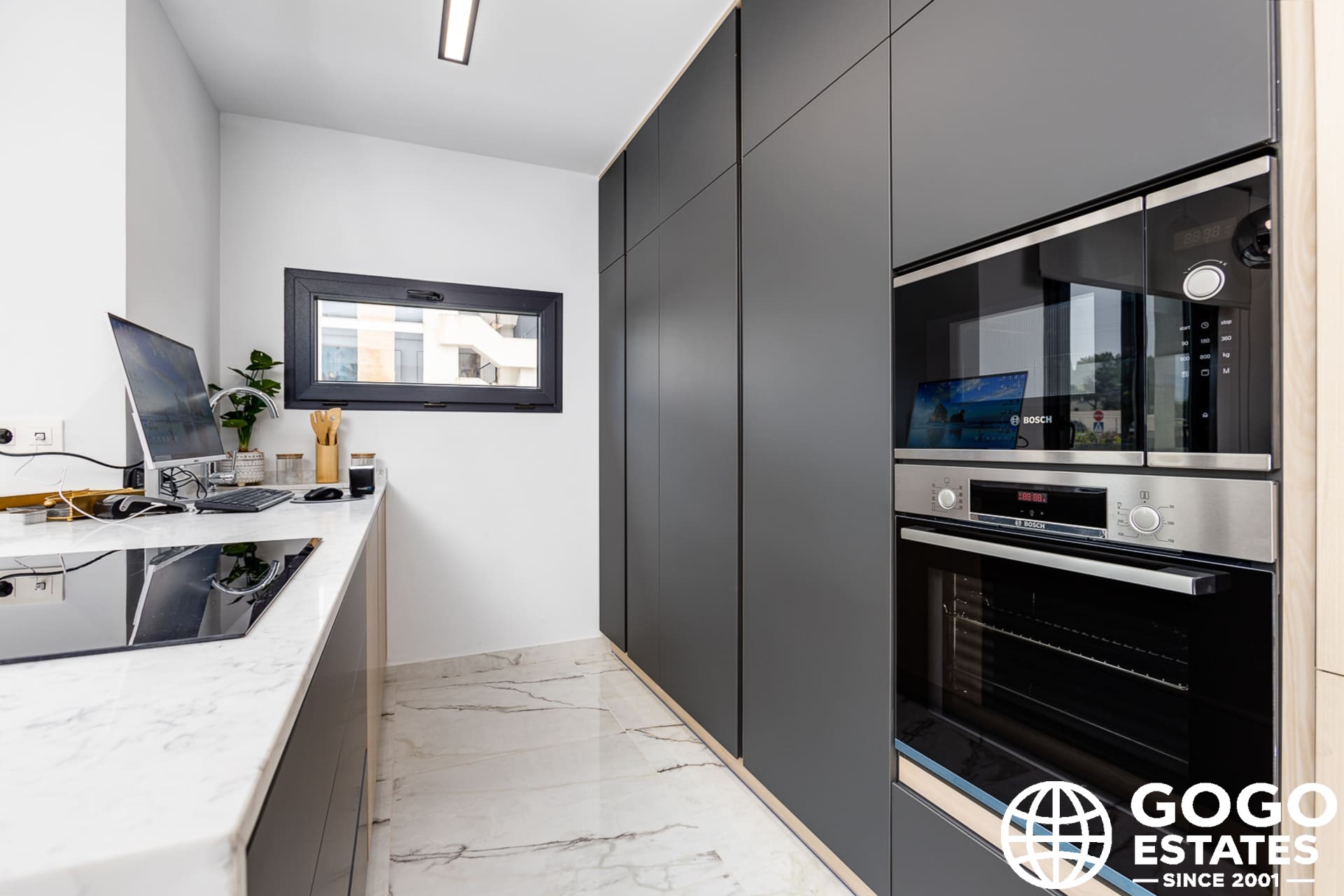Inside, modern amenities such as porcelain stoneware flooring, electric blinds, and air conditioning ensure a comfortable living environment. The kitchen is equipped with high-quality appliances, and the bedrooms have built-in wardrobes for ample storage.