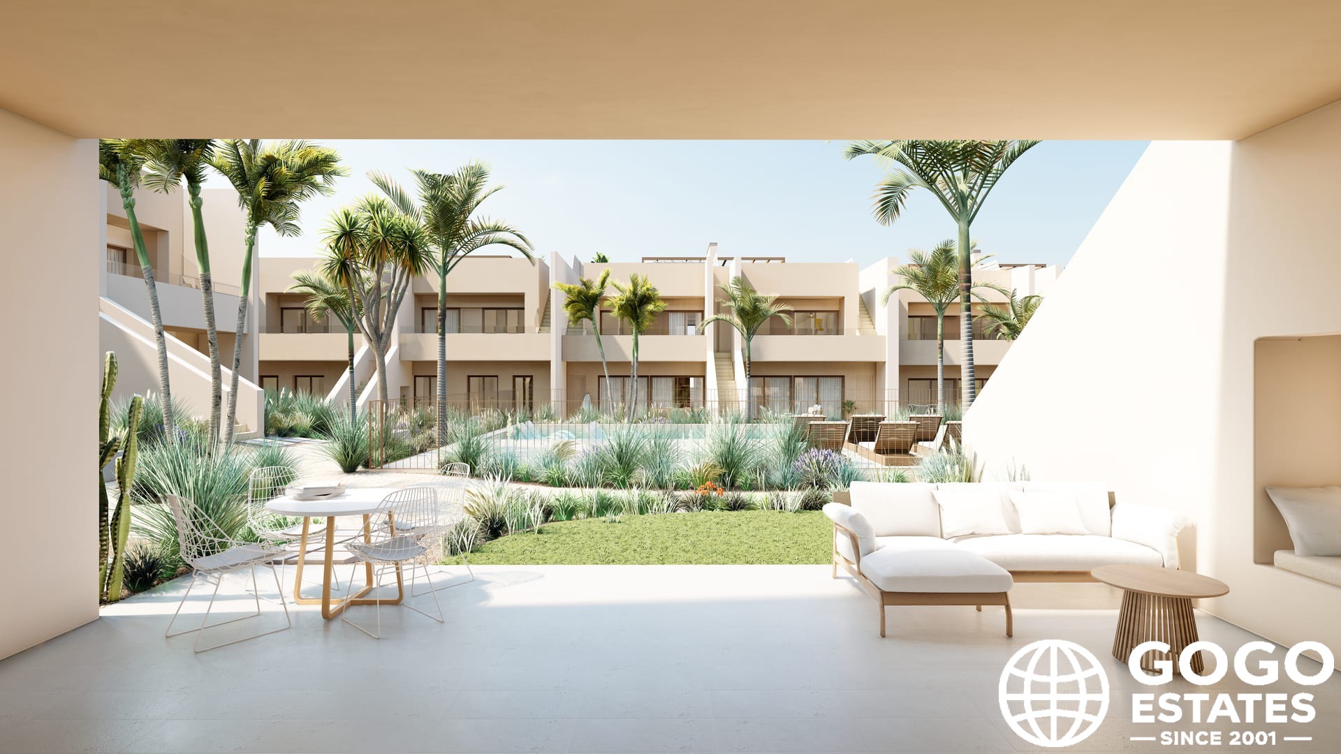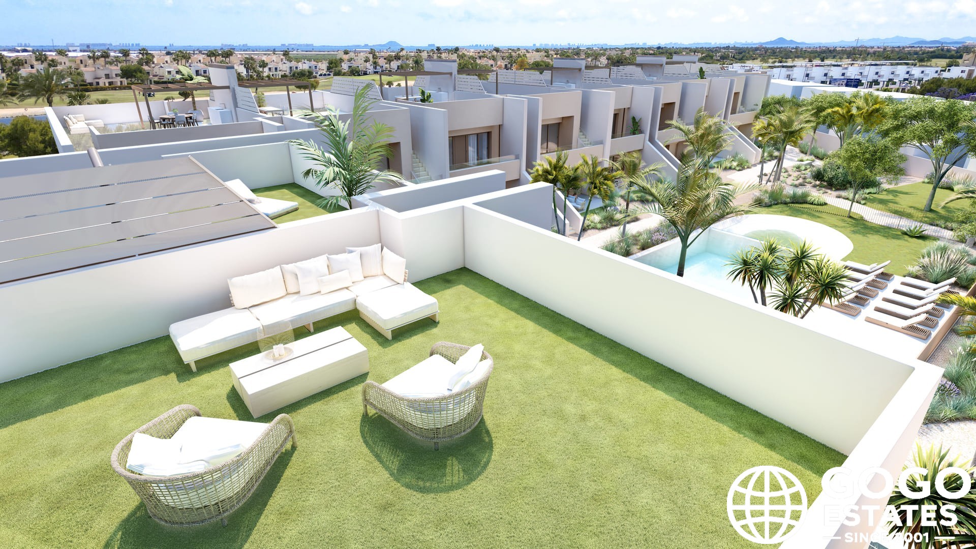 The outdoor spaces are designed to maximize enjoyment of the Mediterranean climate. Each bungalow features a private garden, ideal for relaxing or enjoying outdoor activities. The spacious terraces offer additional leisure space, while the solariums provide a perfect spot for sunbathing.