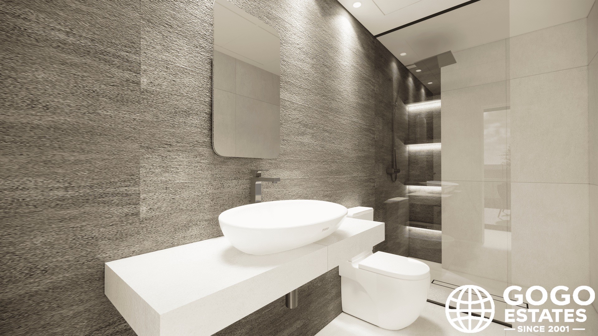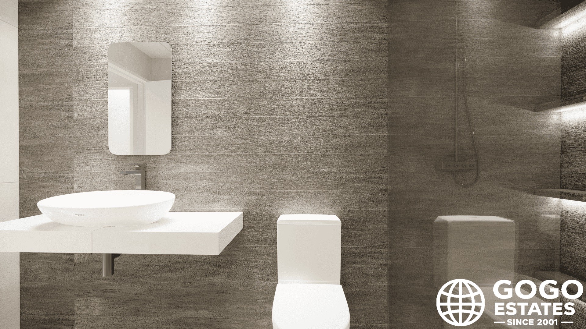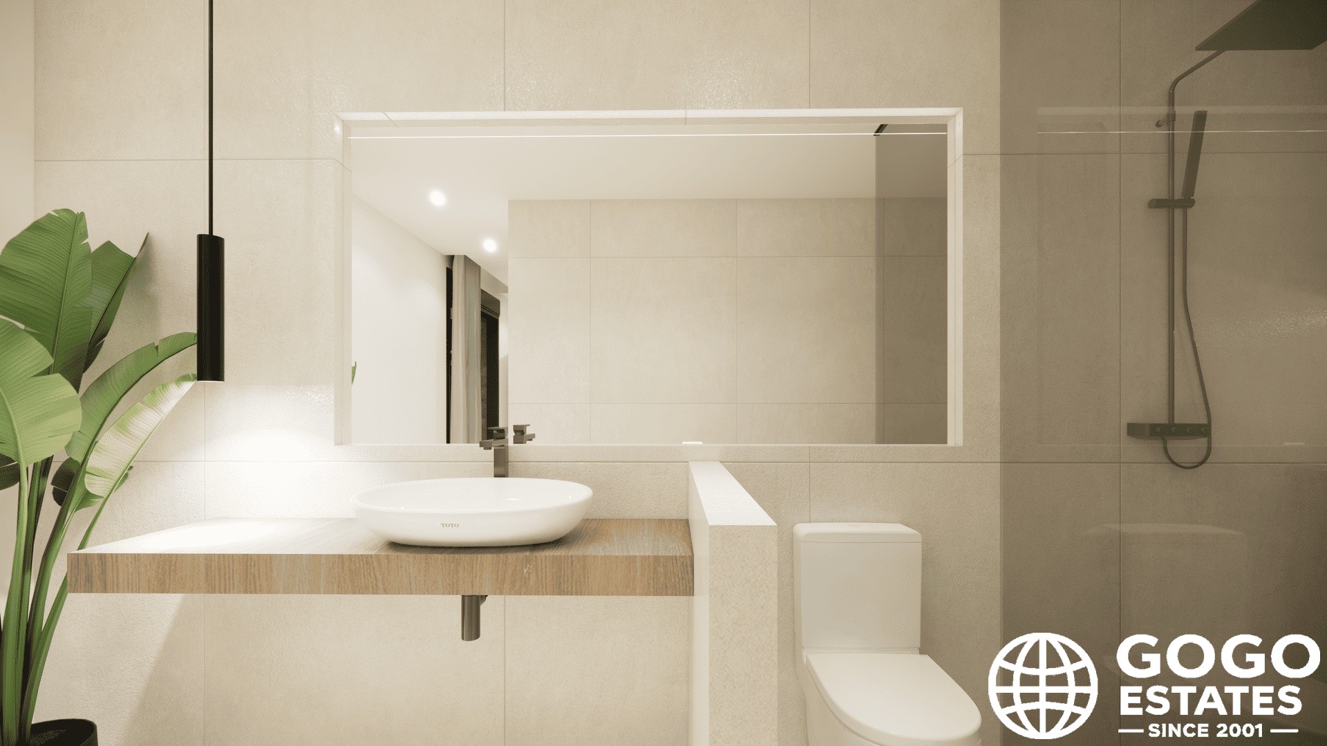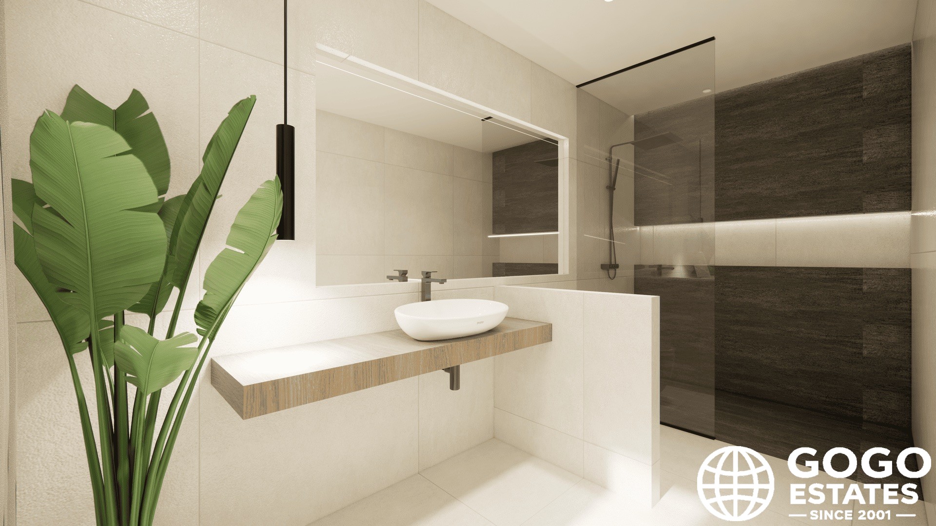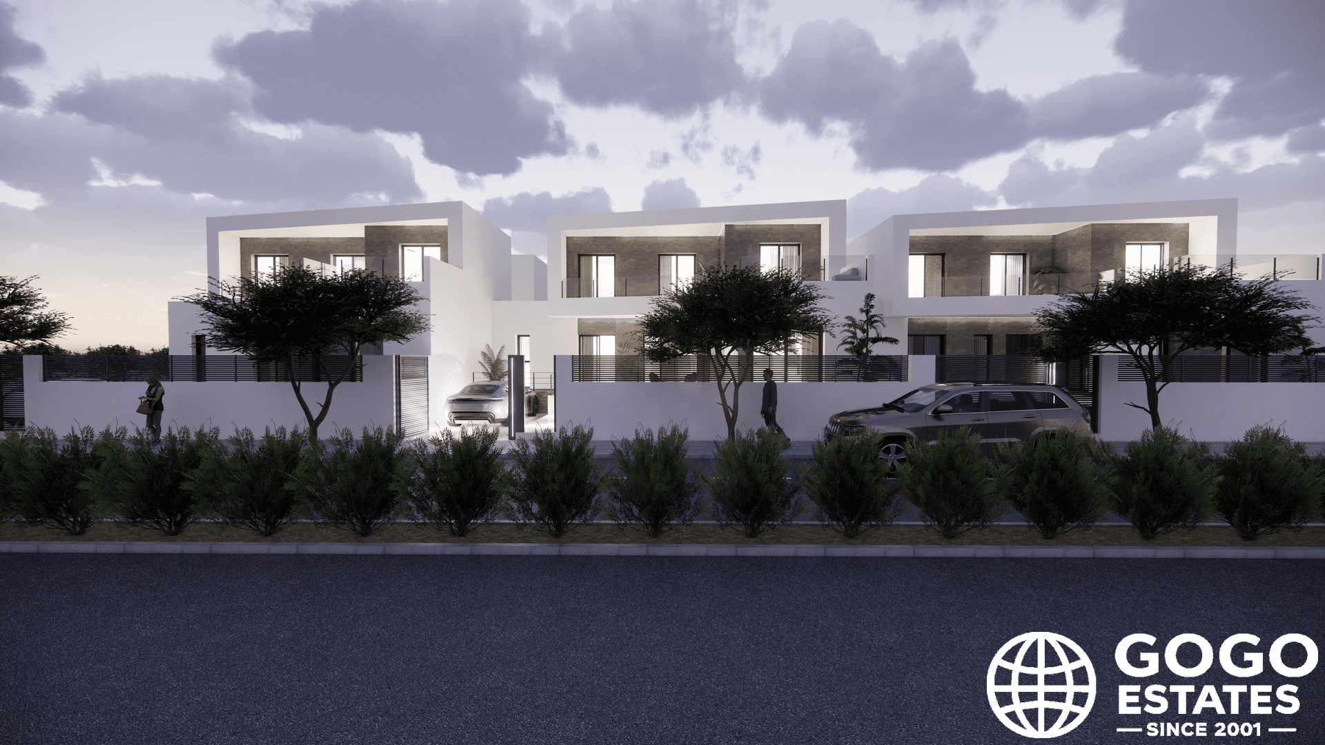 The interior of the townhouses is carefully designed to offer comfort and style. With three bedrooms and three bathrooms, each unit is equipped to meet the needs of families or couples seeking space and privacy. The porcelain tile floors add a modern touch and are easy to maintain, while the built-in wardrobes in the bedrooms offer practical and elegant storage solutions. The layout includes a garage, ensuring a secure space for the vehicle and additional storage.
