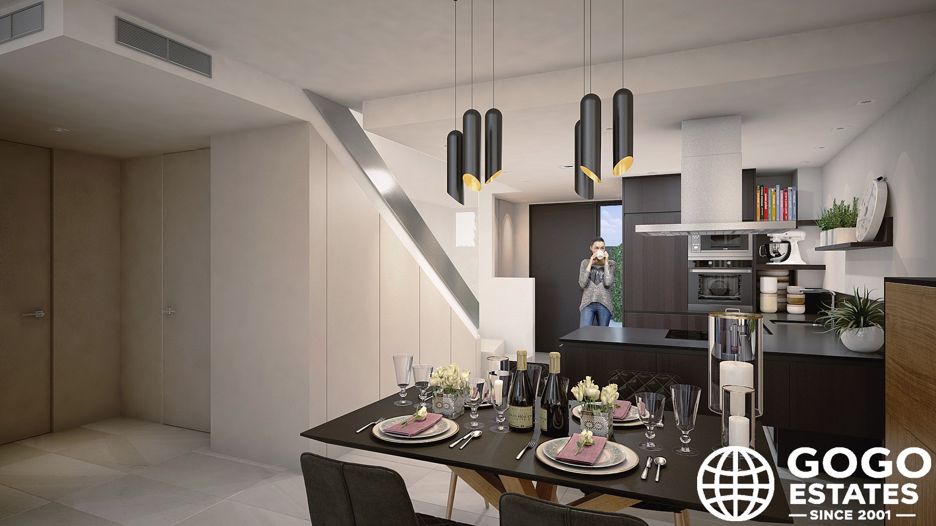 The exteriors are crafted to maximize enjoyment of the Mediterranean climate, with a private garden, terrace, solarium, and a luxurious private pool. The proximity to the golf course, just 1 km away, provides easy access to outdoor sports.
