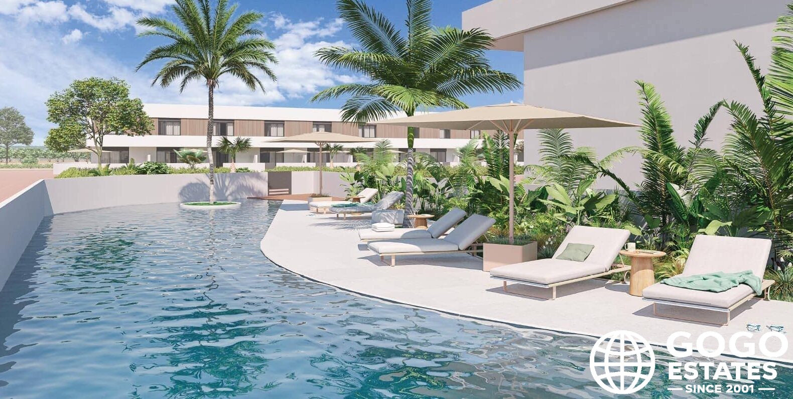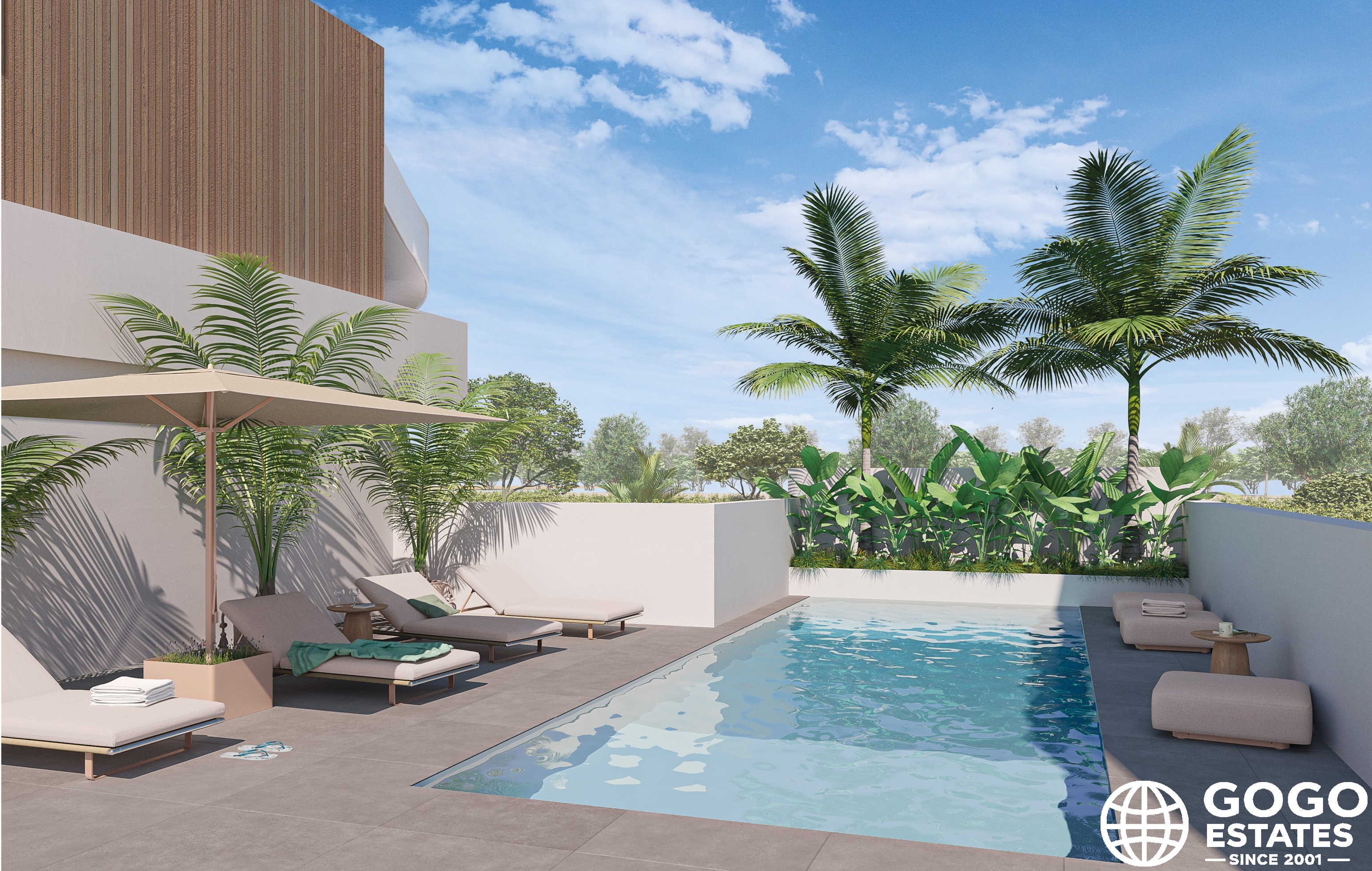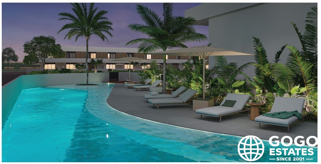 The exteriors of these townhouses are designed to enjoy the Mediterranean climate. Each home features a private garden and a spacious terrace, perfect for outdoor relaxation. The solarium offers panoramic views, ideal for sunbathing or stargazing.