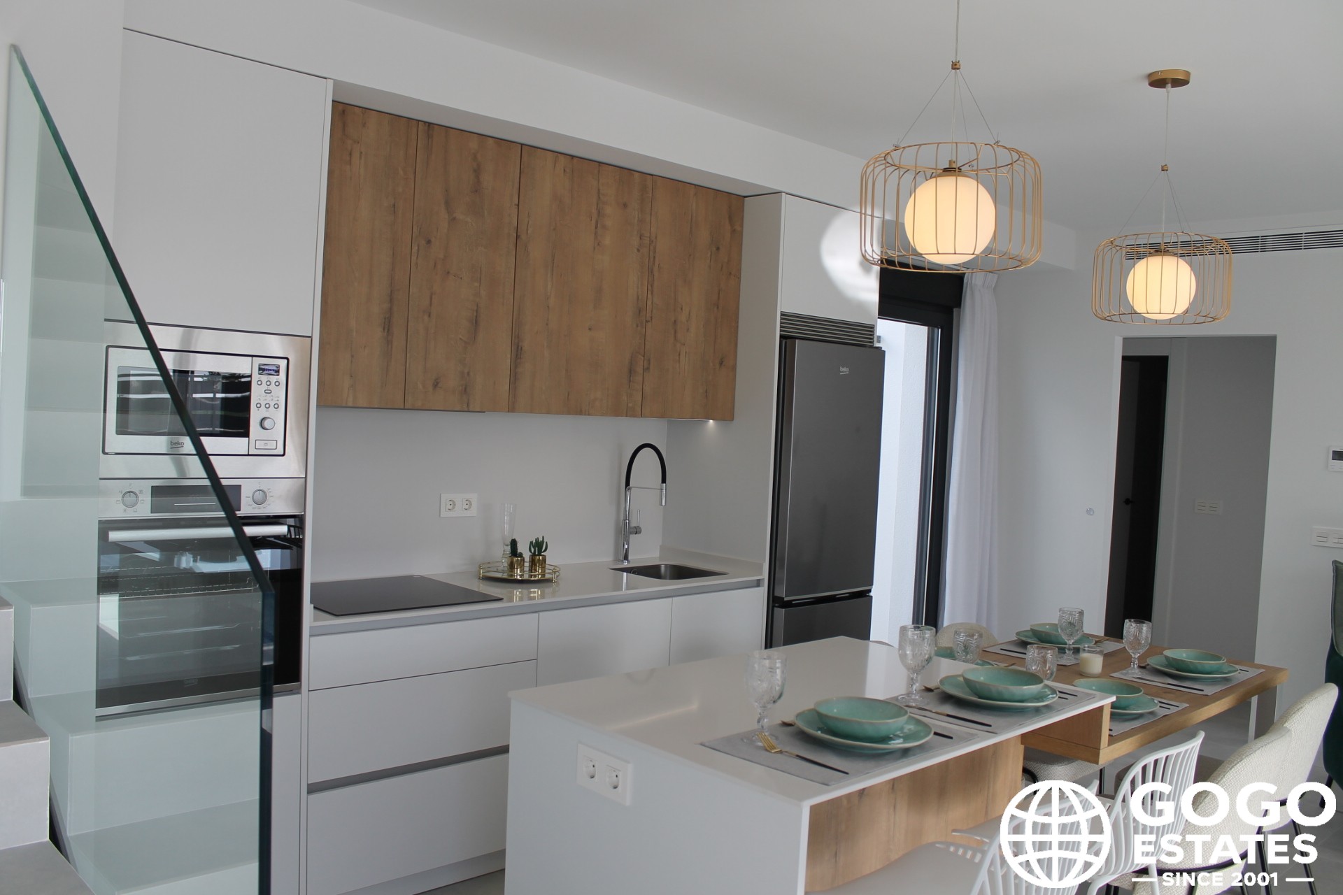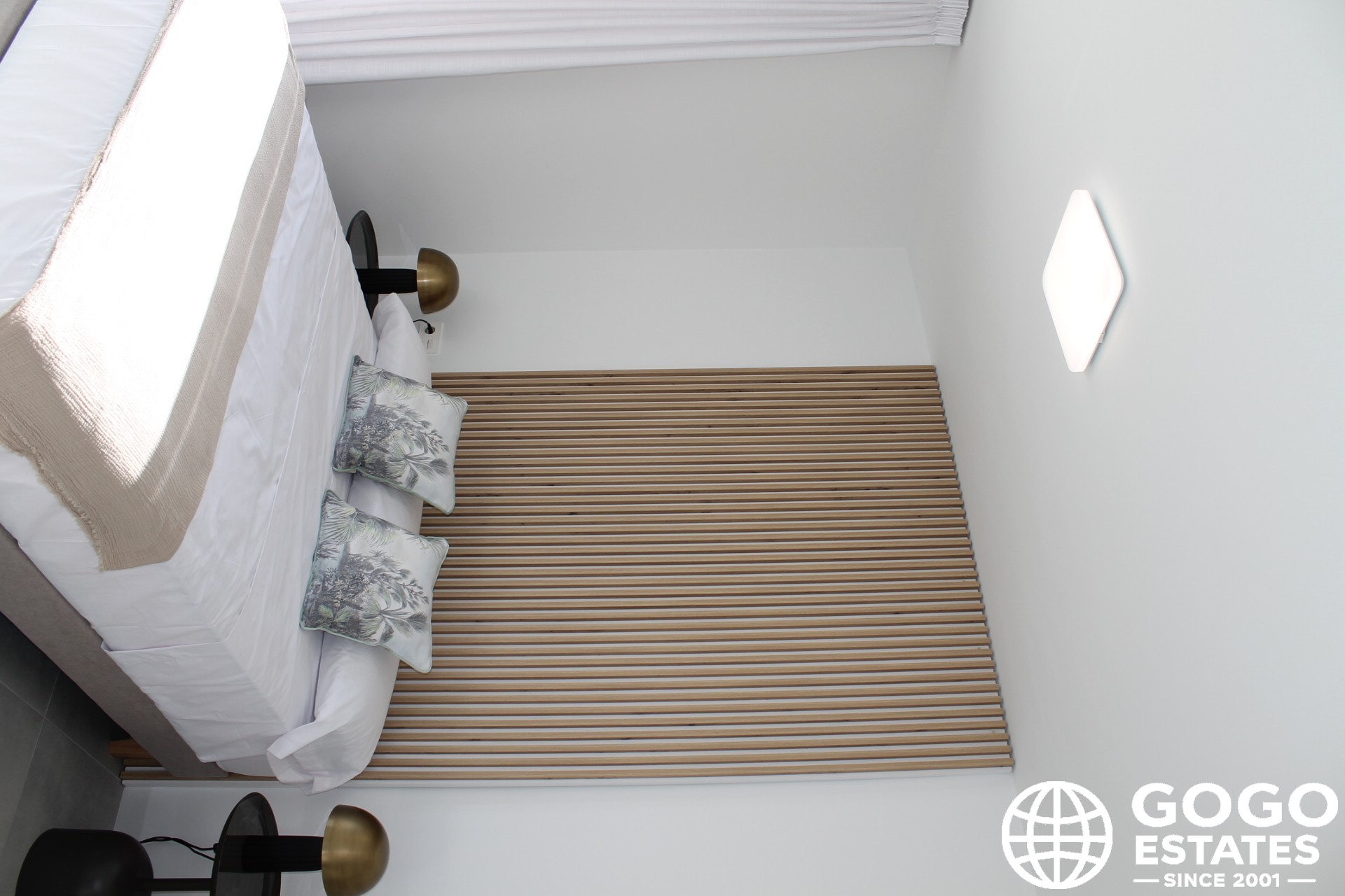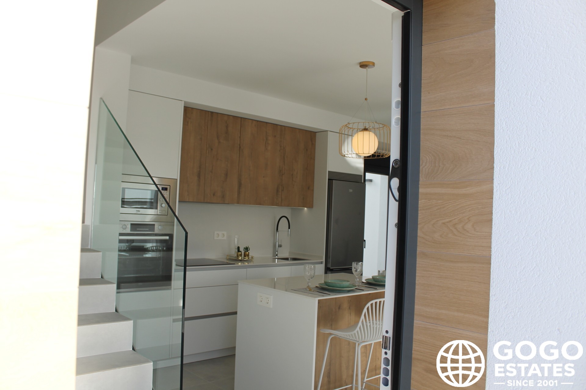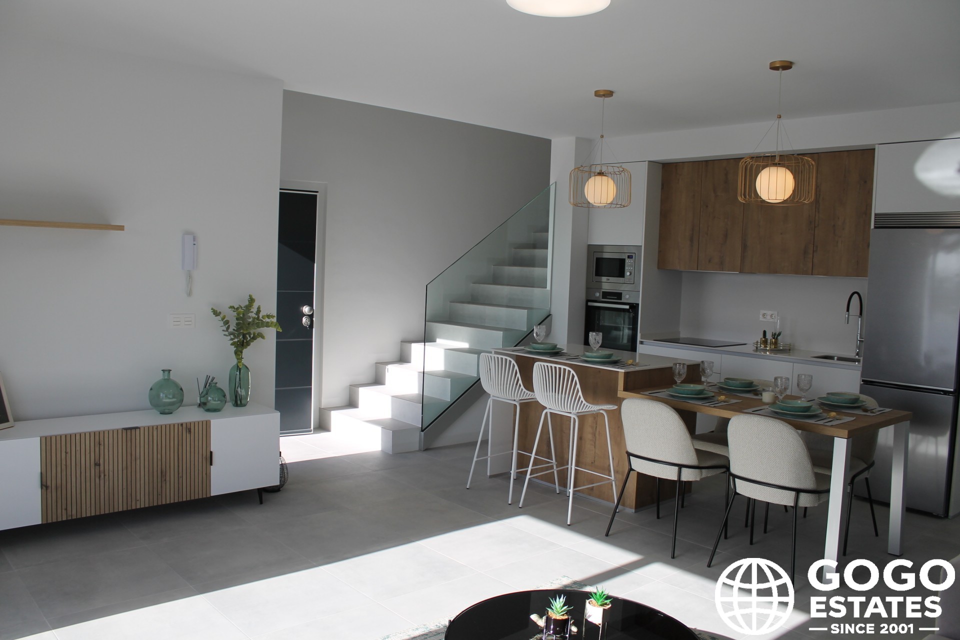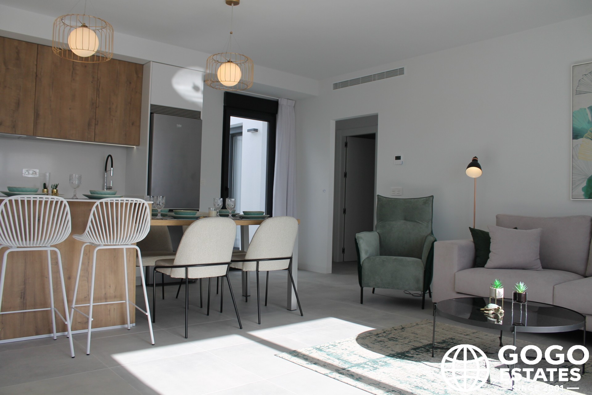 Interiors are thoughtfully designed with ceramic and porcelain tile floors, built-in wardrobes, and pre-installed air conditioning. A video intercom provides added security.
