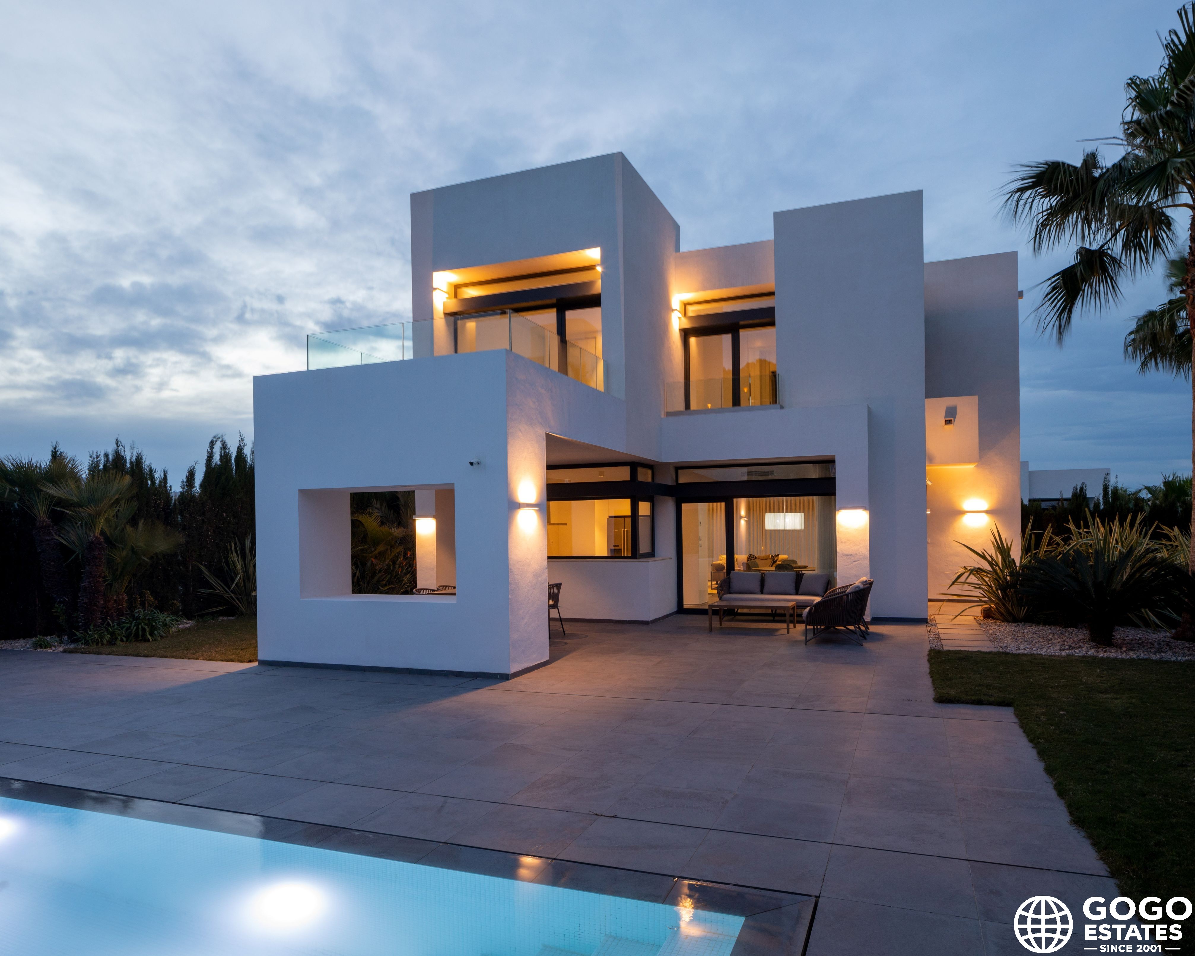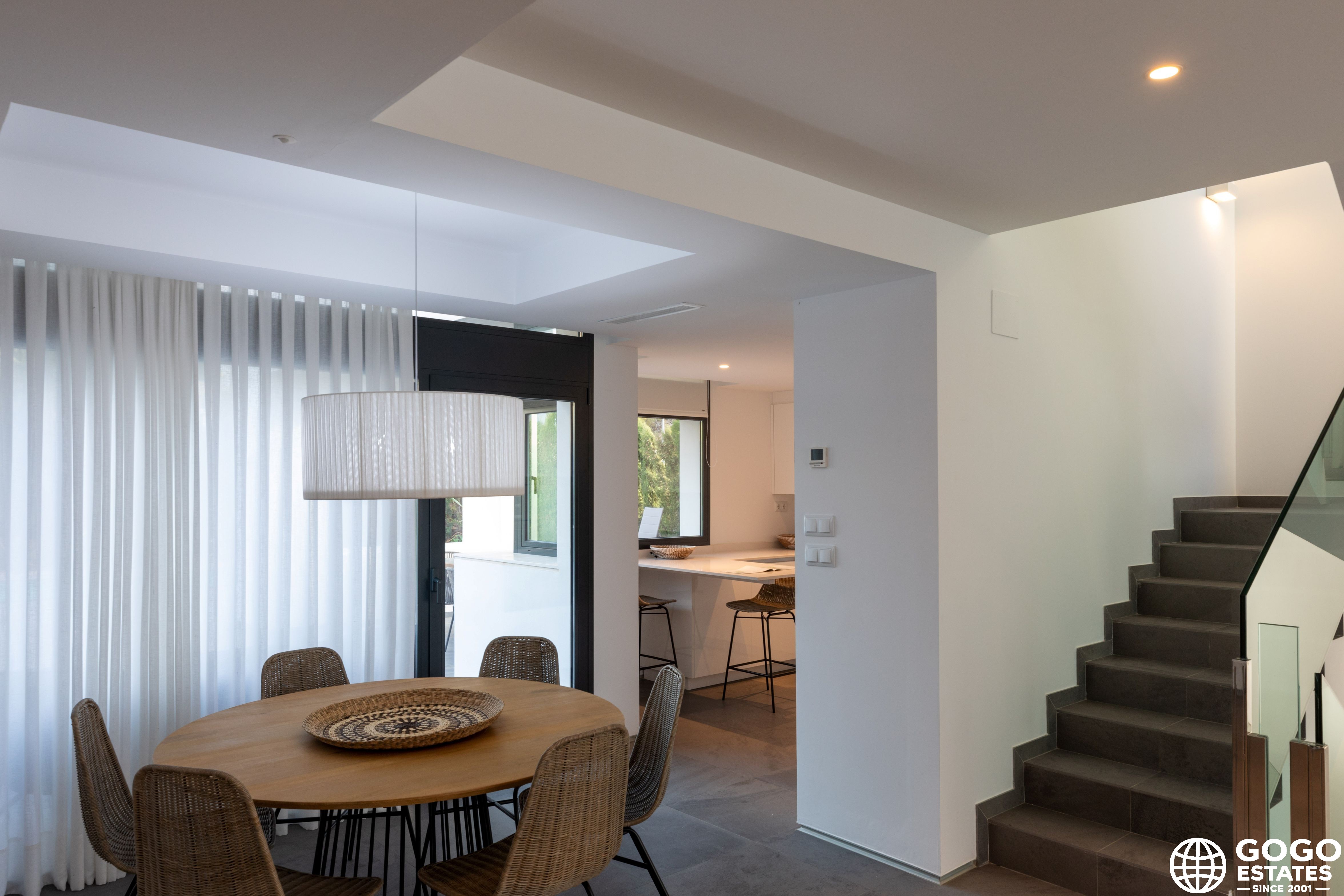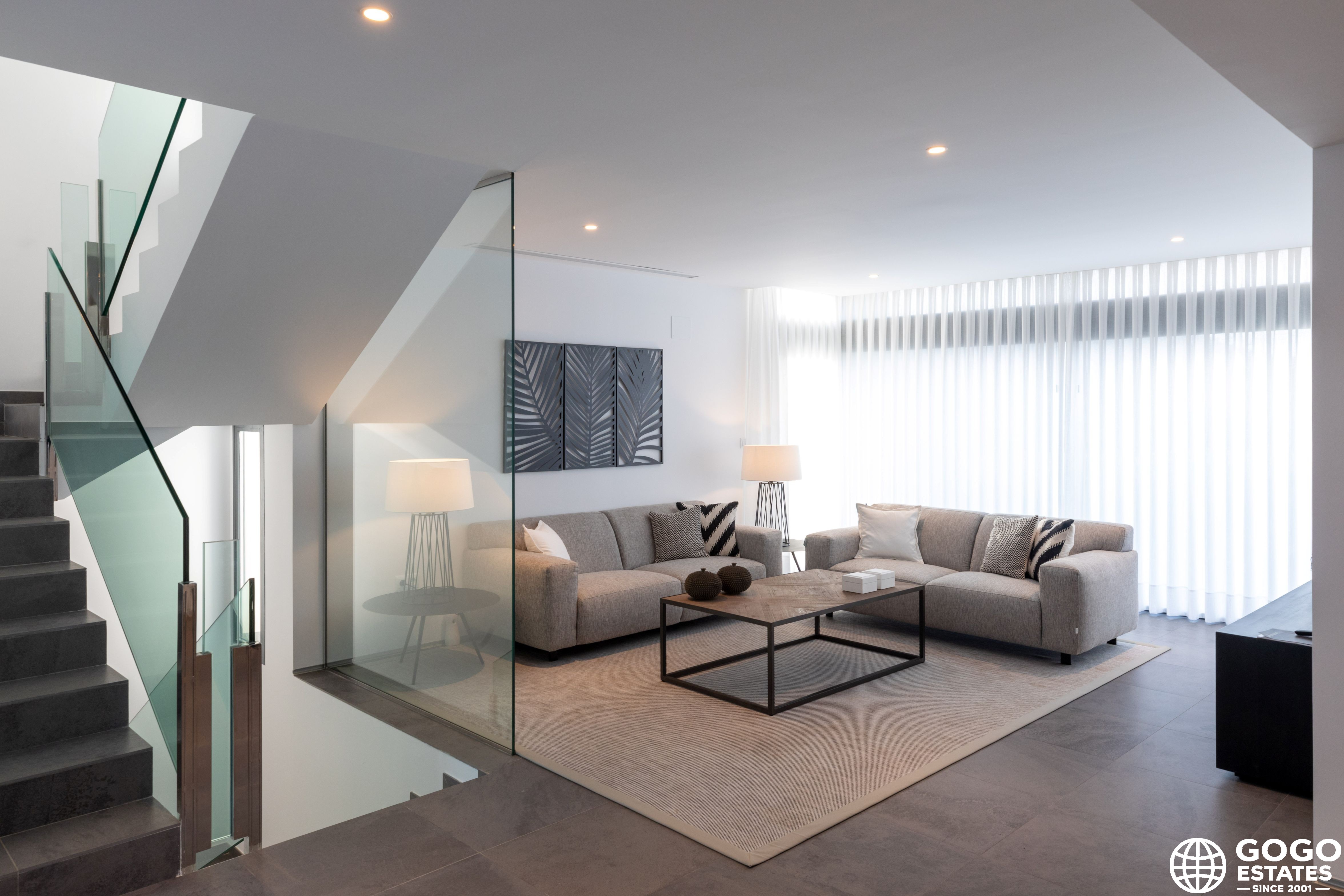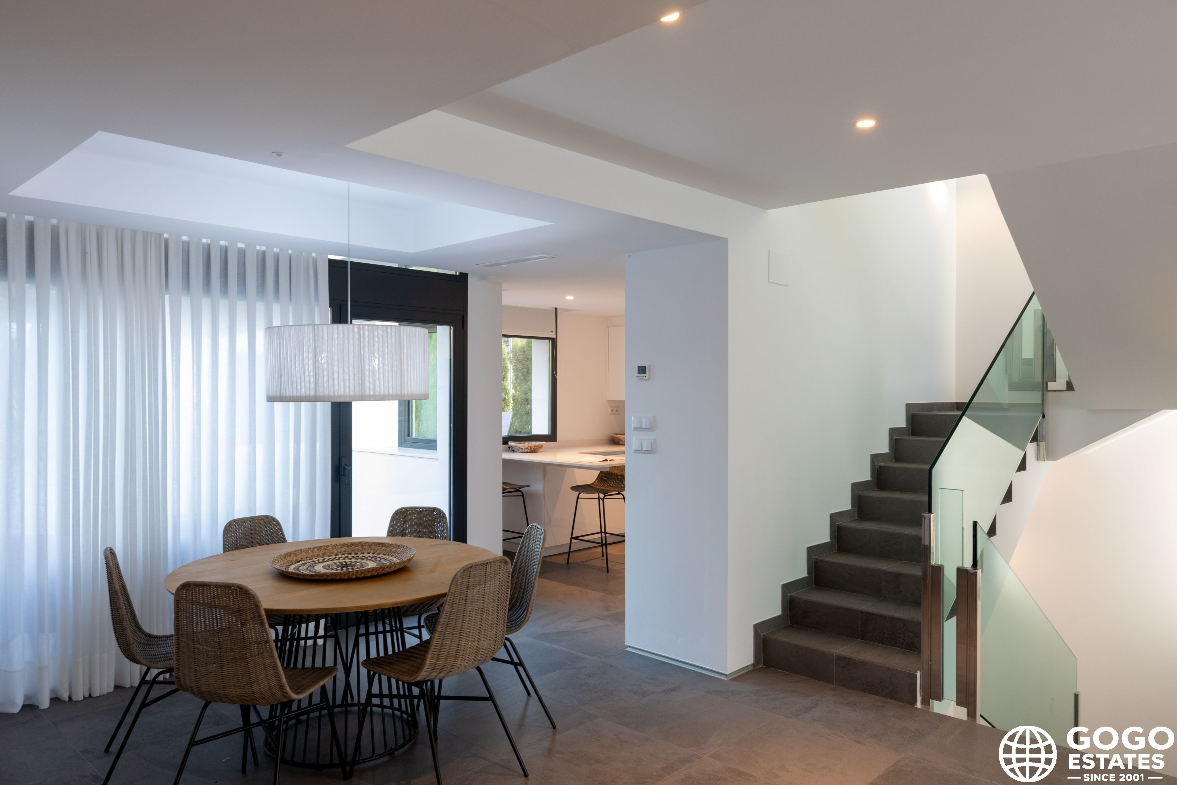 The properties feature an exterior design that includes a spacious garden and terrace, perfect for enjoying the Mediterranean climate. The presence of a garage provides convenience and security for parking. Inside, the homes are equipped with porcelain tile floors, a smart home system, and air conditioning. Built-in wardrobes optimize storage space.
