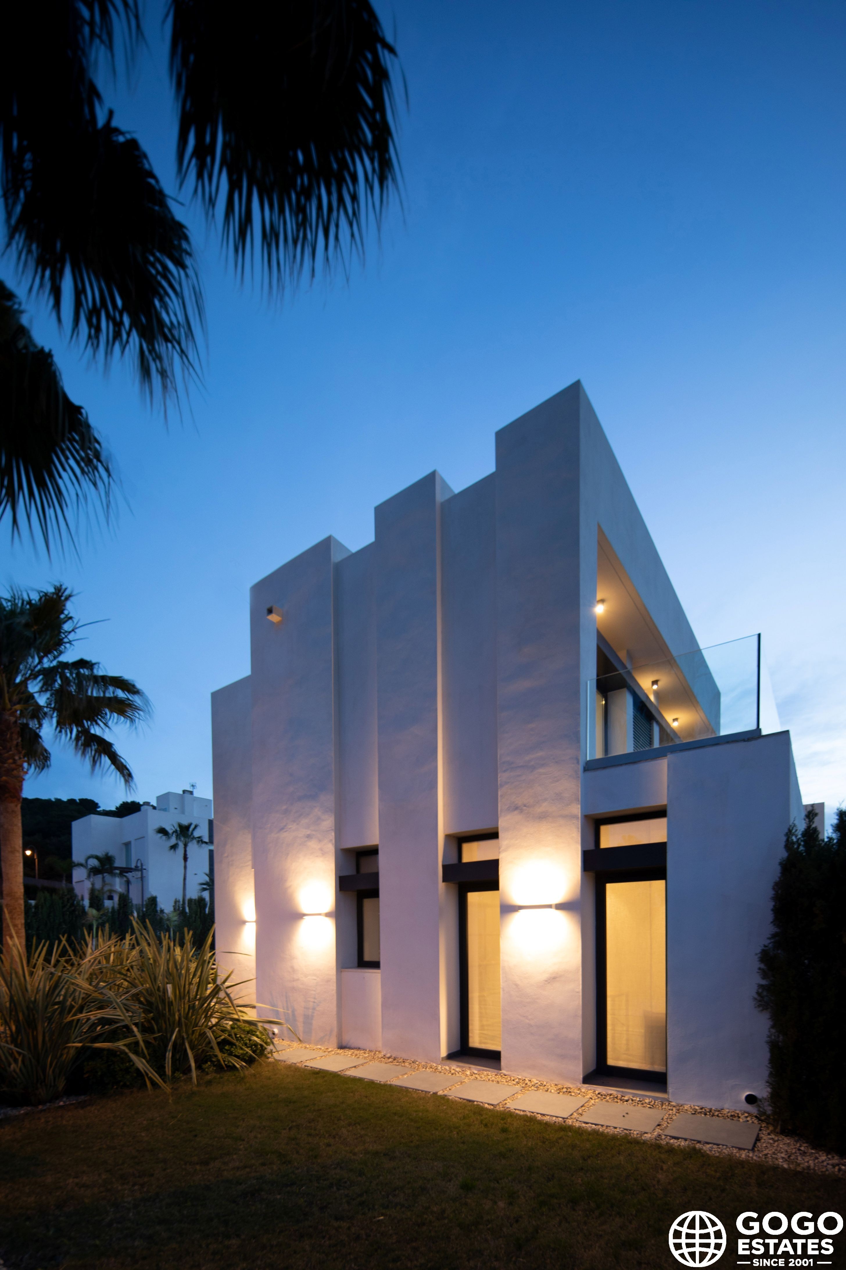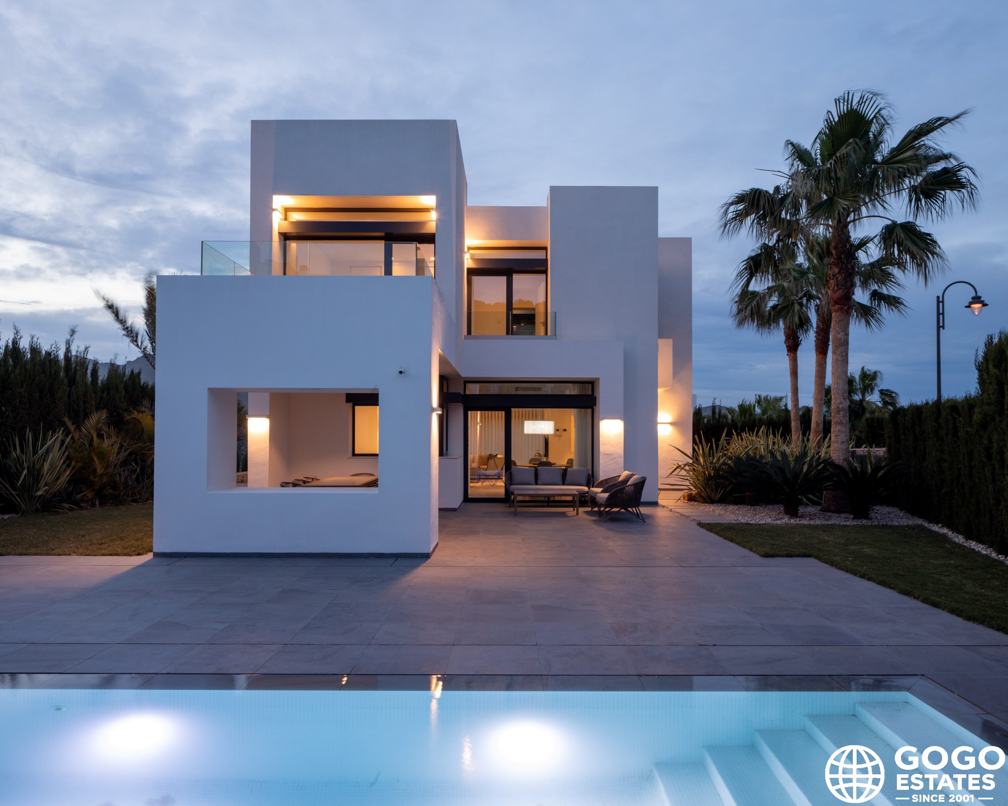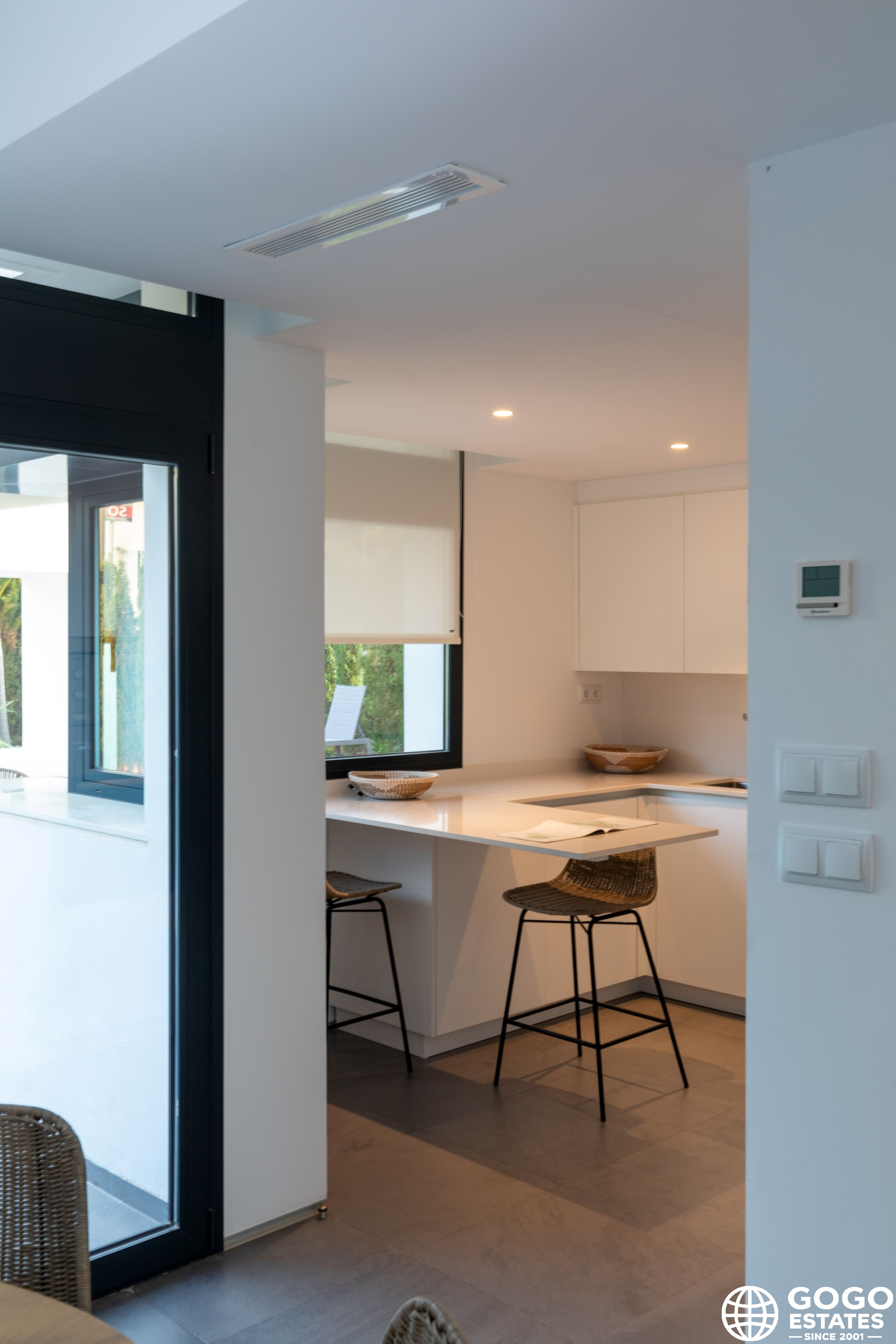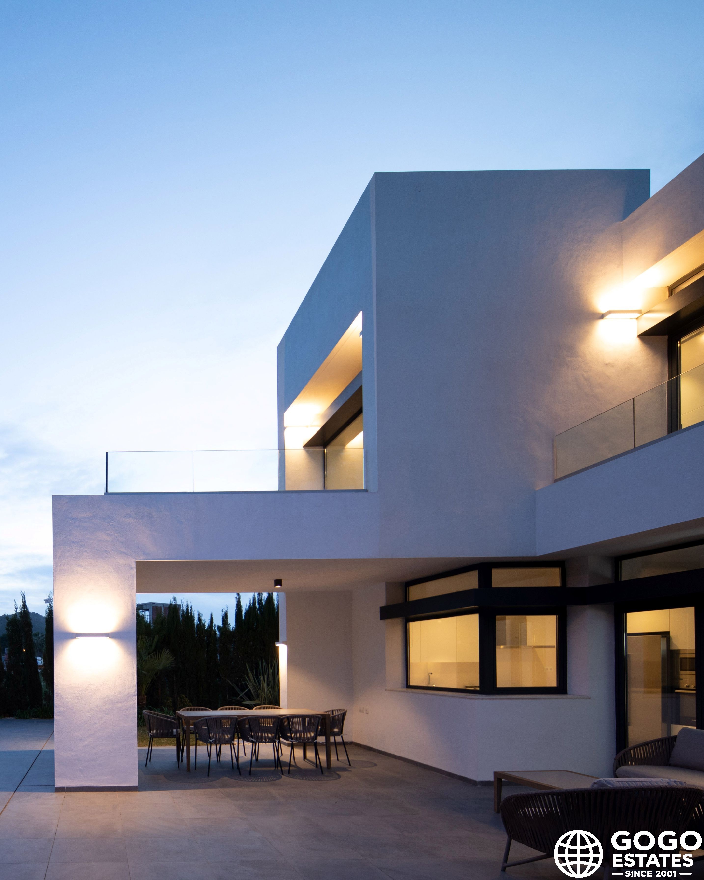 The properties feature an exterior design that includes a spacious garden and terrace, perfect for enjoying the Mediterranean climate. The presence of a garage provides convenience and security for parking. Inside, the homes are equipped with porcelain tile floors, a smart home system, and air conditioning. Built-in wardrobes optimize storage space.