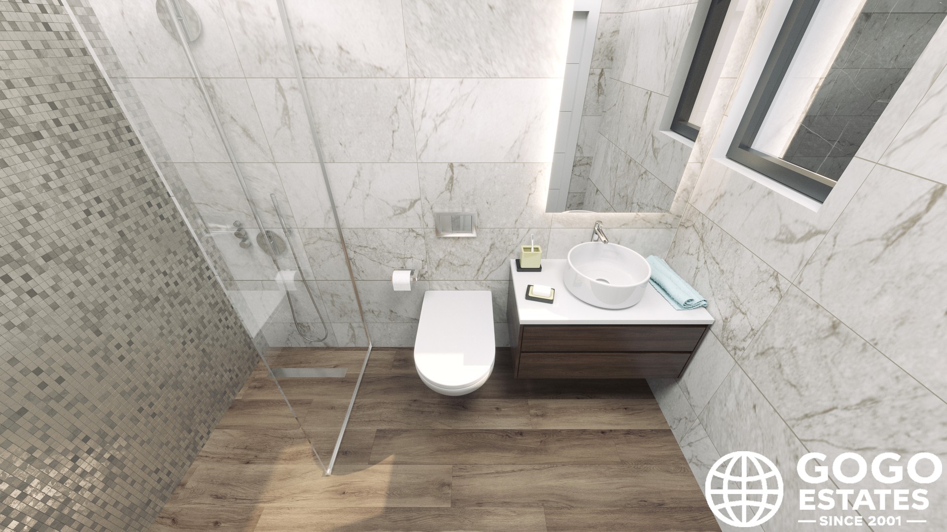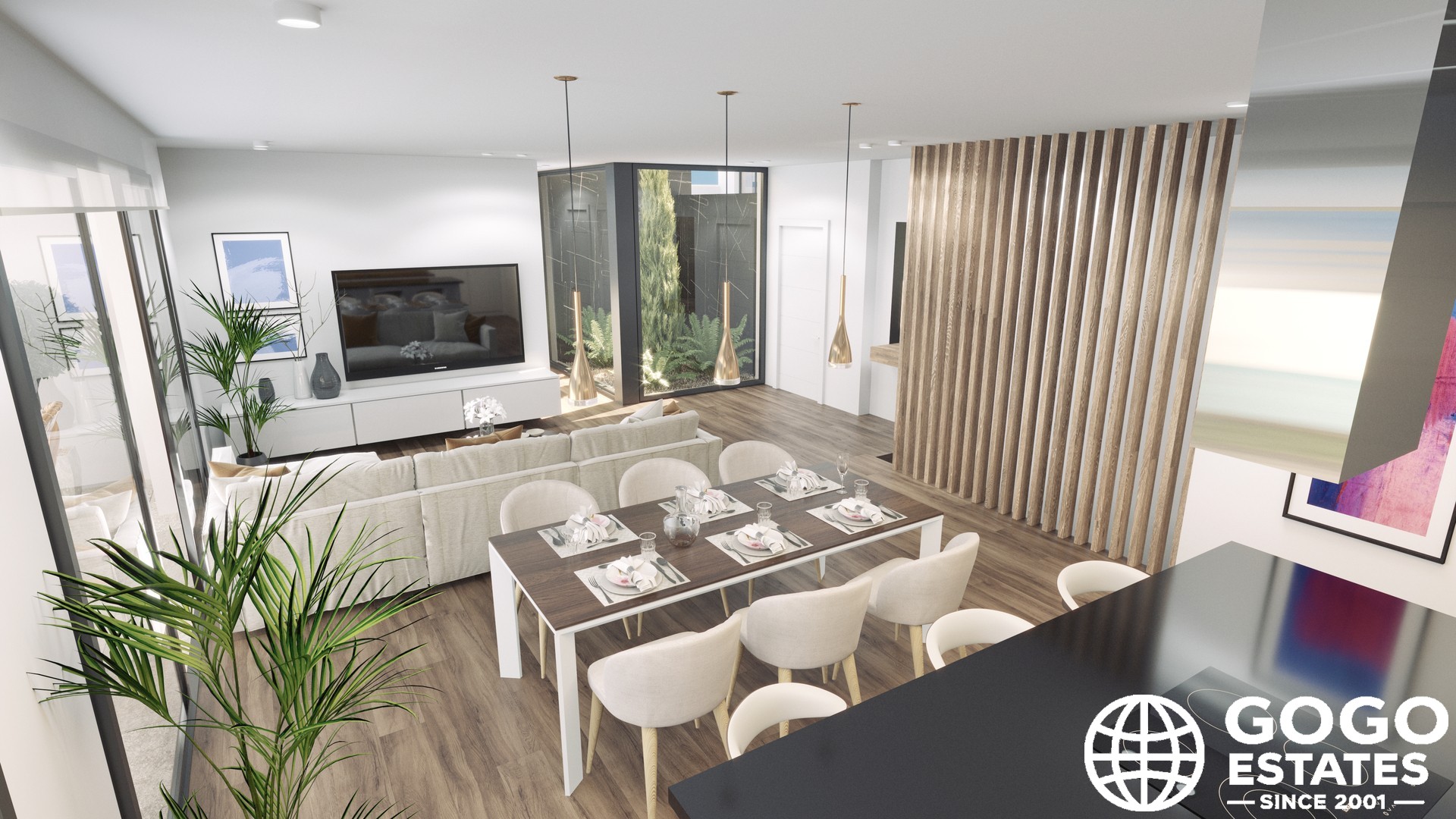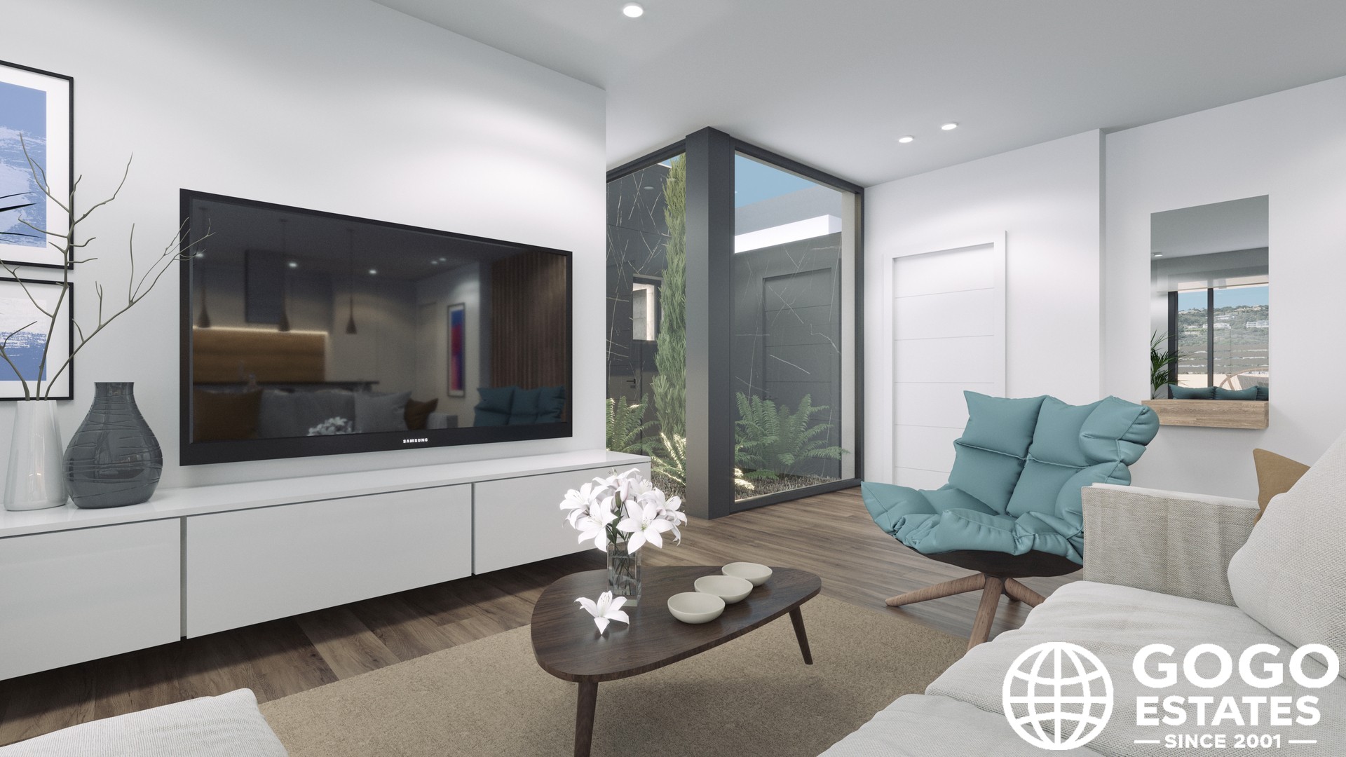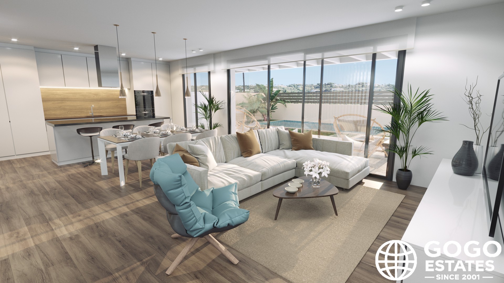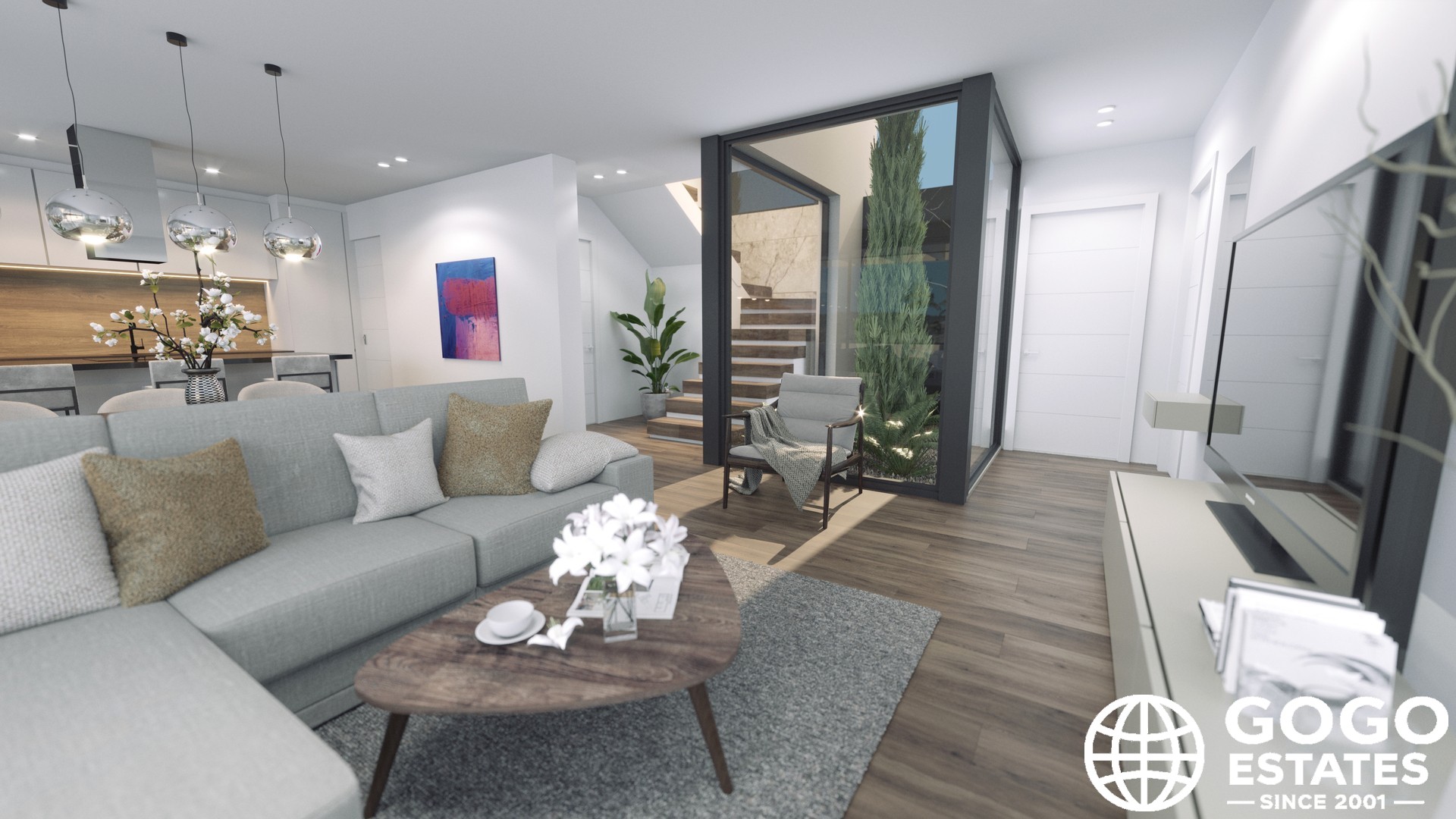 Interiors are designed for comfort and functionality, with 3 bedrooms and 3 bathrooms. Porcelain stoneware floors and high-quality kitchen appliances enhance modern living. Built-in wardrobes offer efficient storage, and each home includes a garage for convenience.