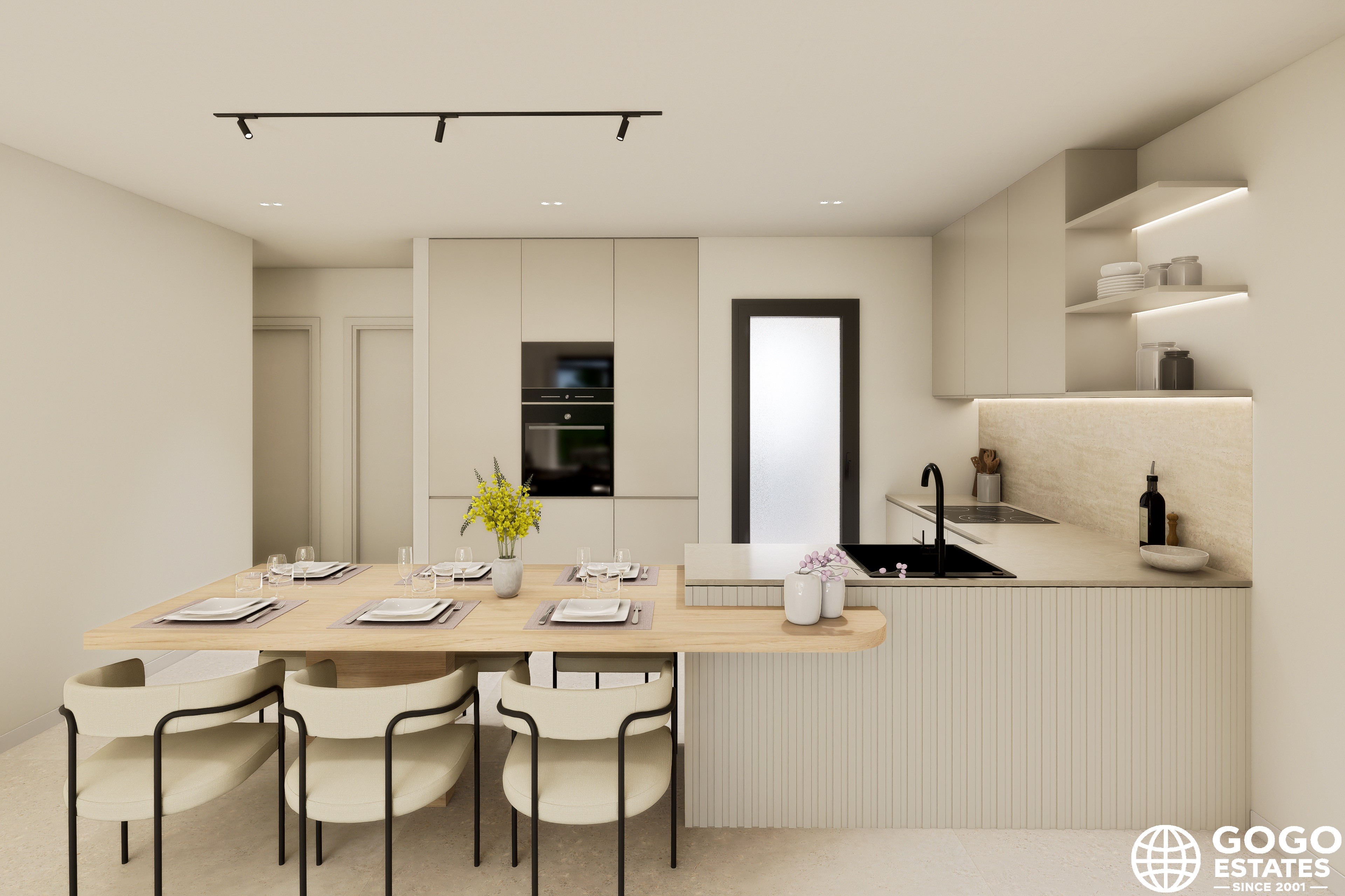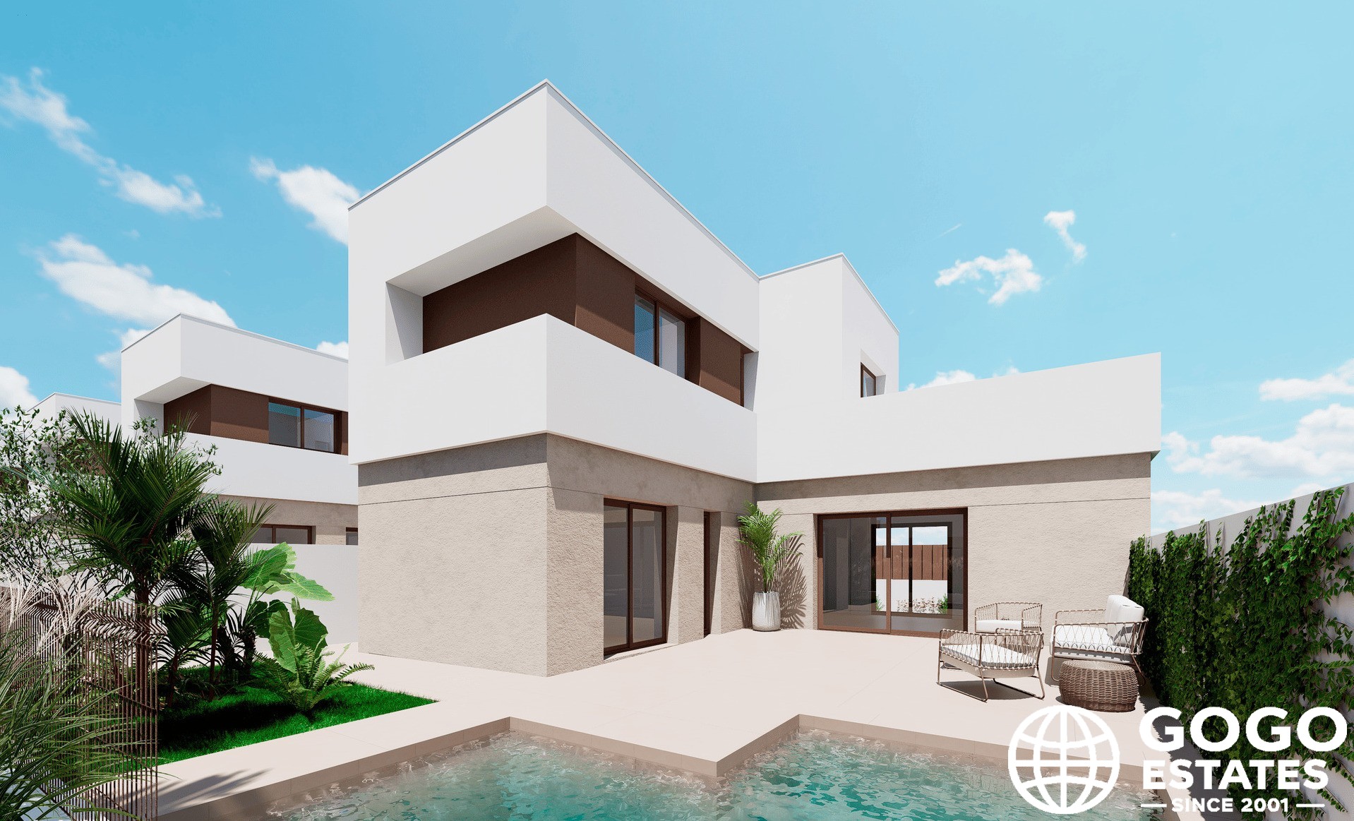 Inside, the home is designed with modern touches, including porcelain tile floors, electric shutters, and built-in wardrobes. Pre-installed air conditioning ensures comfort throughout the year.