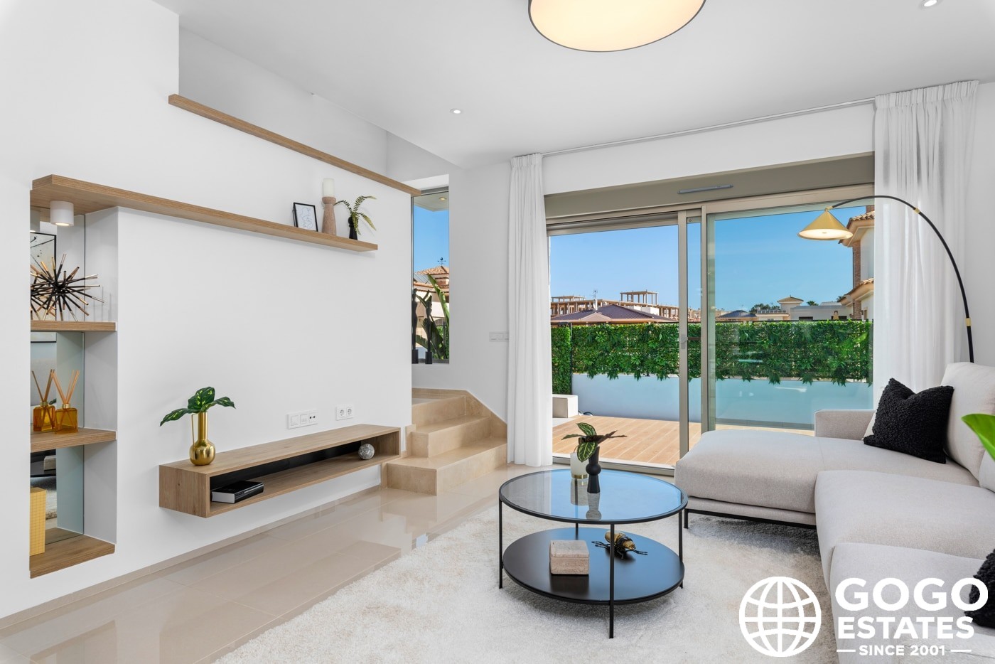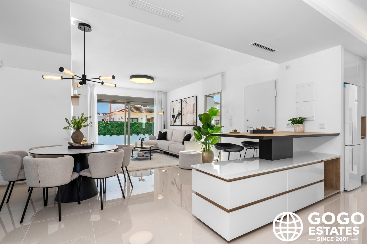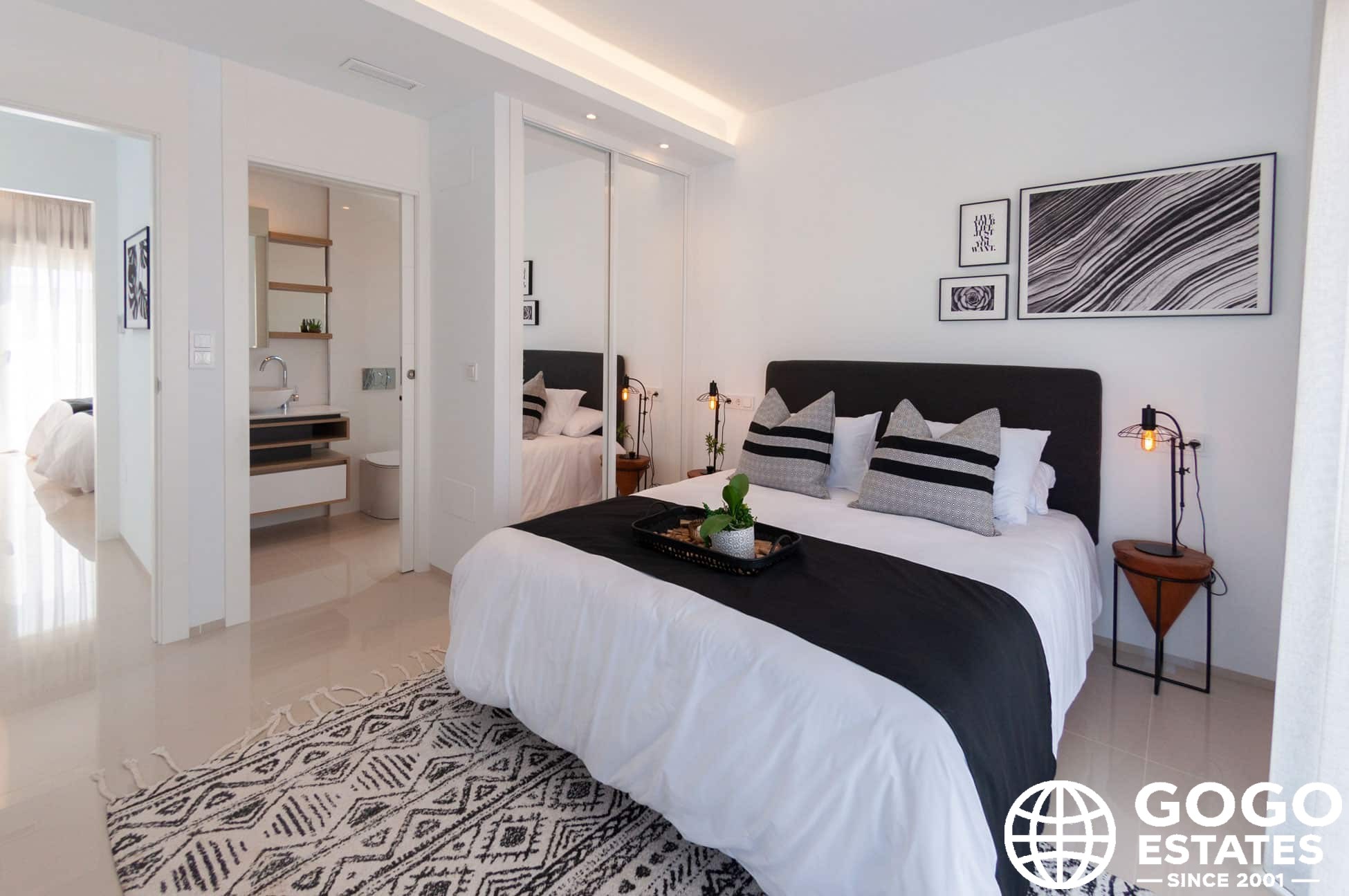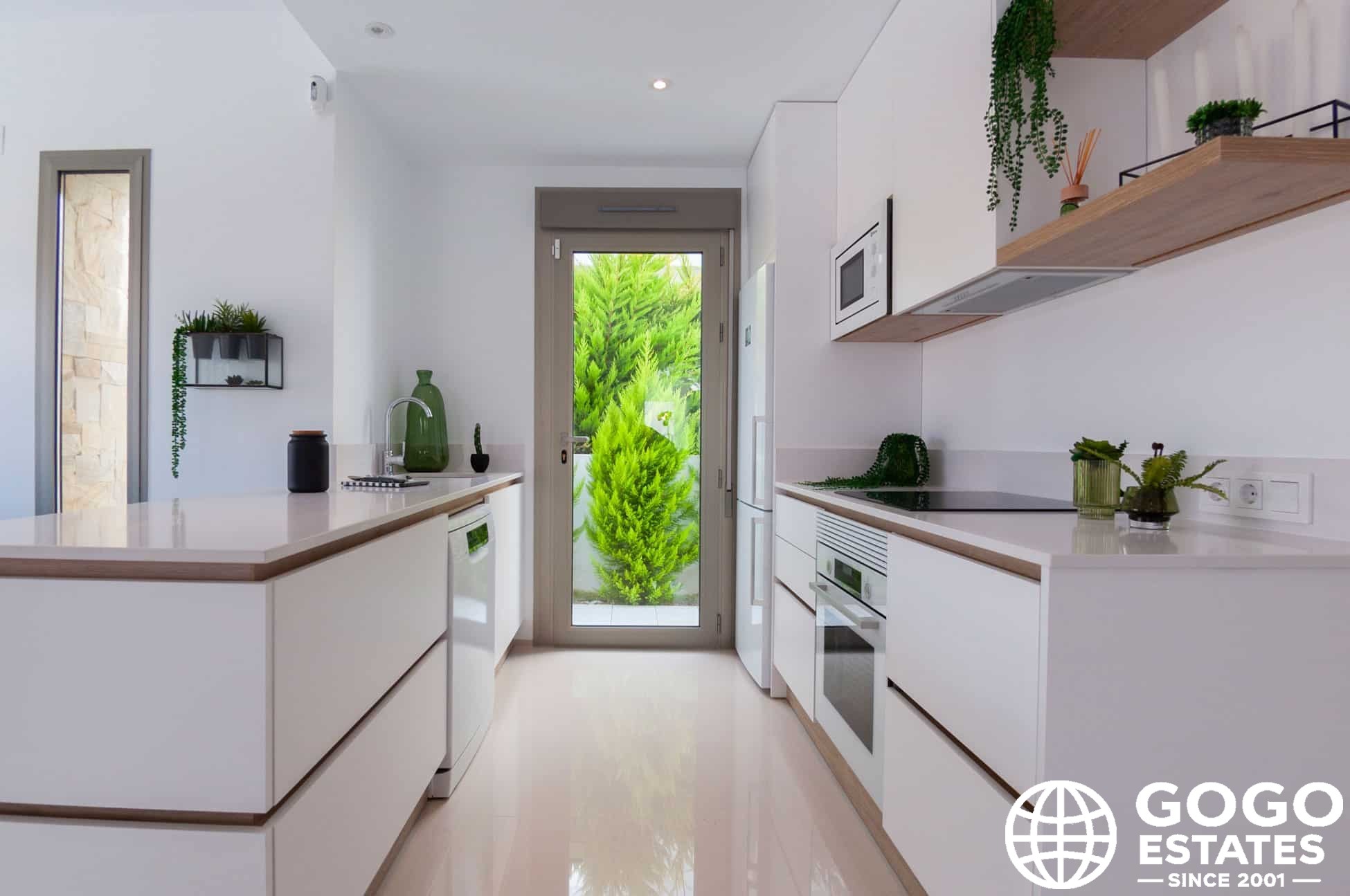 Inside, the villas provide three bedrooms and three bathrooms, with built-in wardrobes and a modern kitchen. Porcelain tile flooring and air conditioning ensure comfort and elegance.