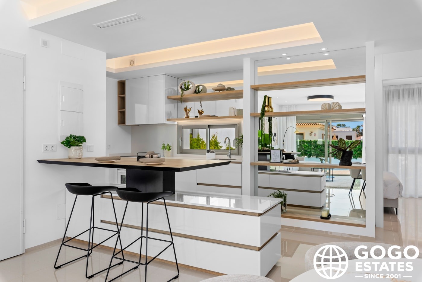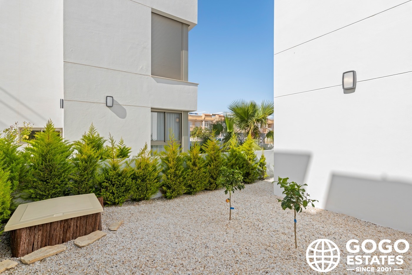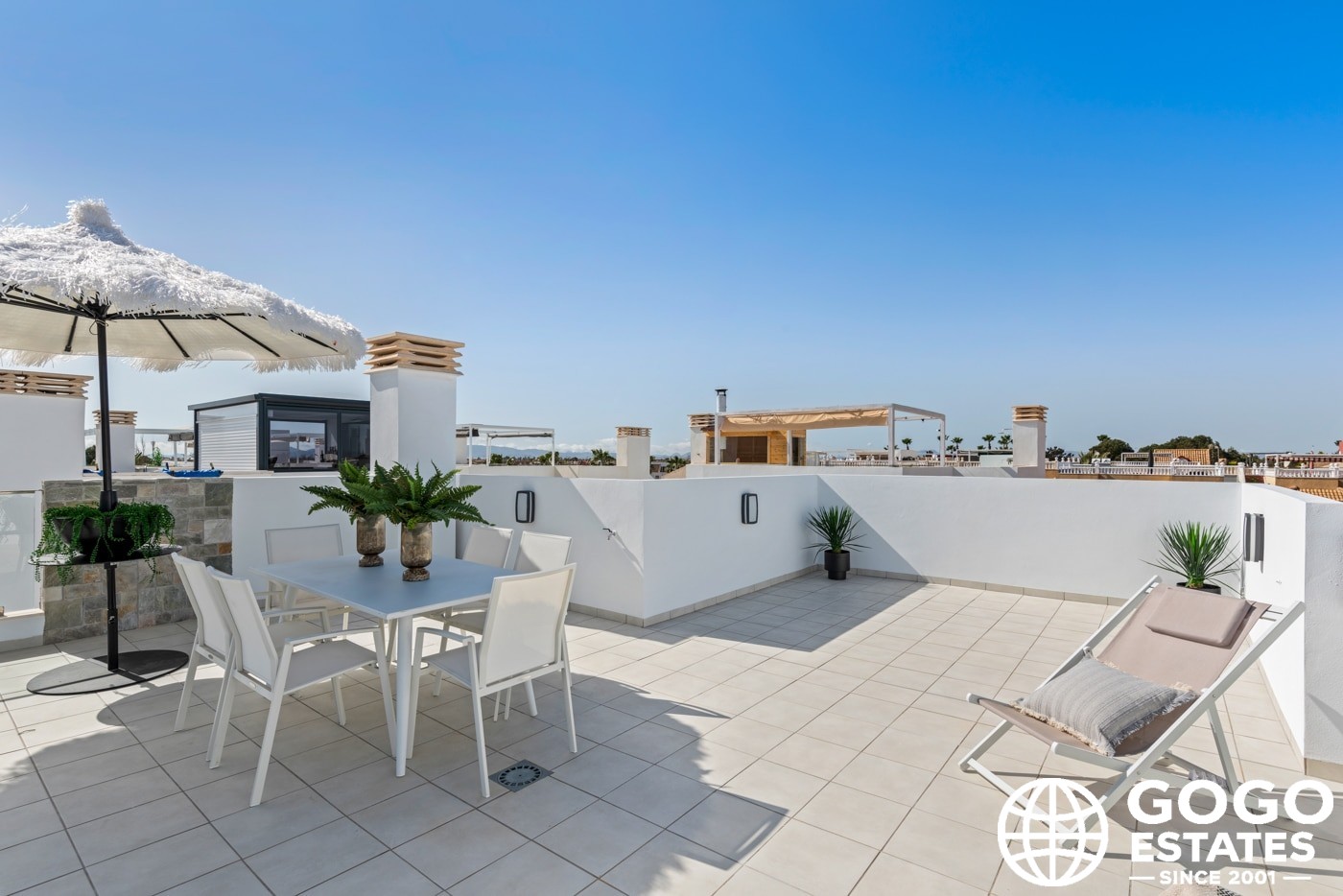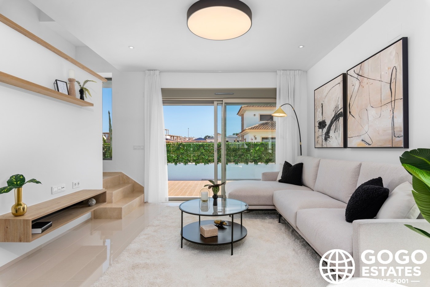 Inside, the villas provide three bedrooms and three bathrooms, with built-in wardrobes and a modern kitchen. Porcelain tile flooring and air conditioning ensure comfort and elegance.
