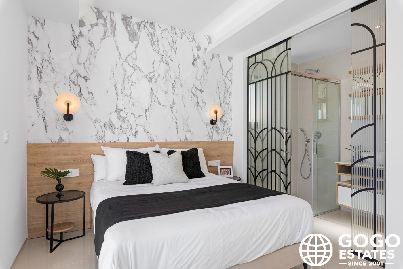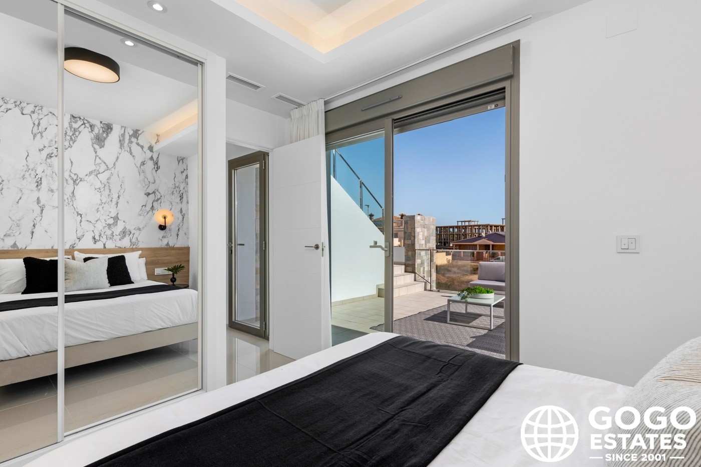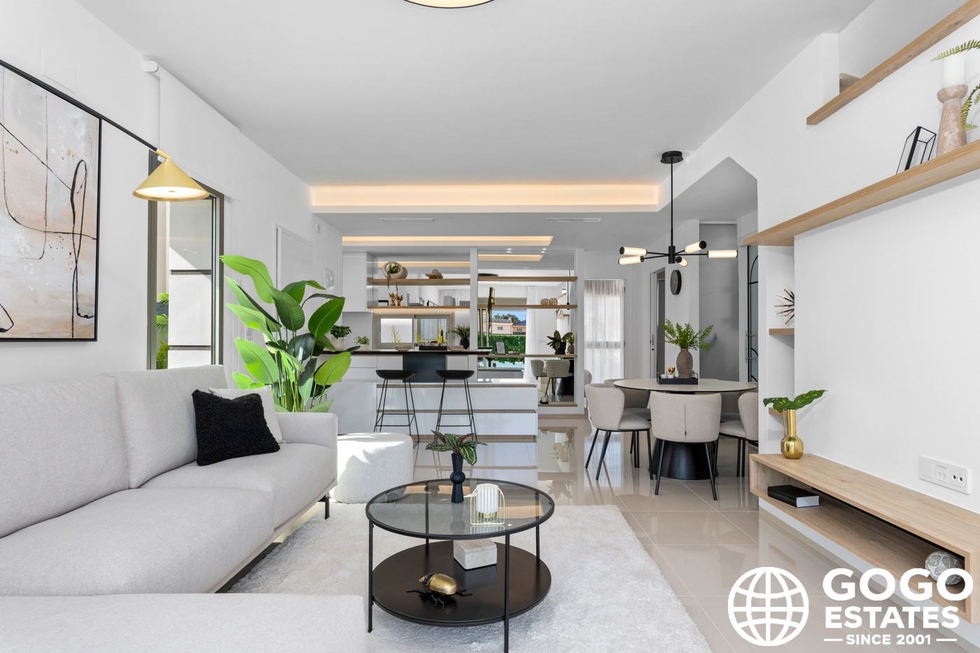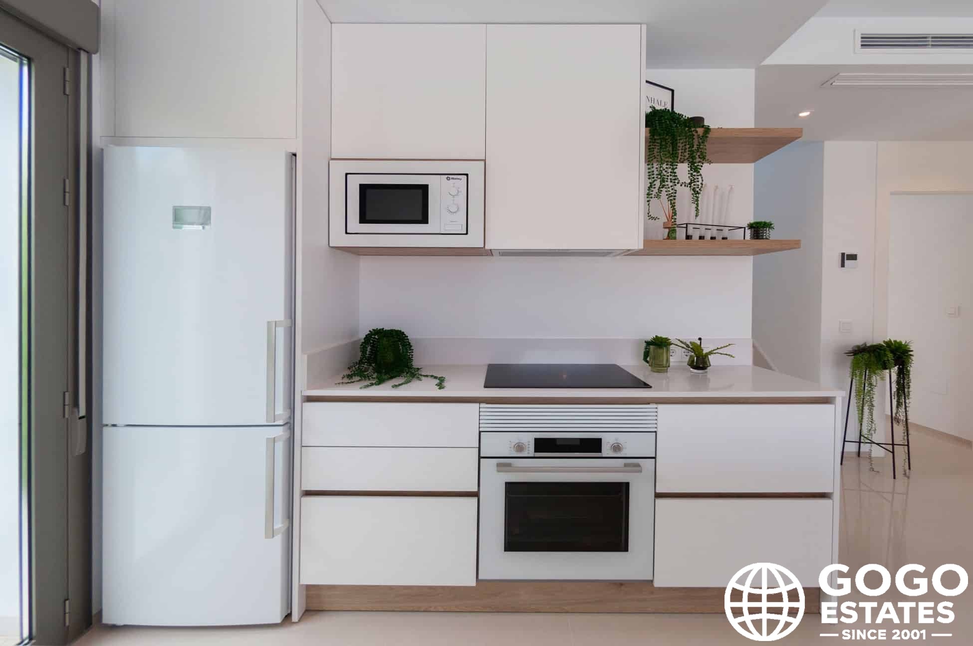 Inside, the villas provide three bedrooms and three bathrooms, with built-in wardrobes and a modern kitchen. Porcelain tile flooring and air conditioning ensure comfort and elegance.