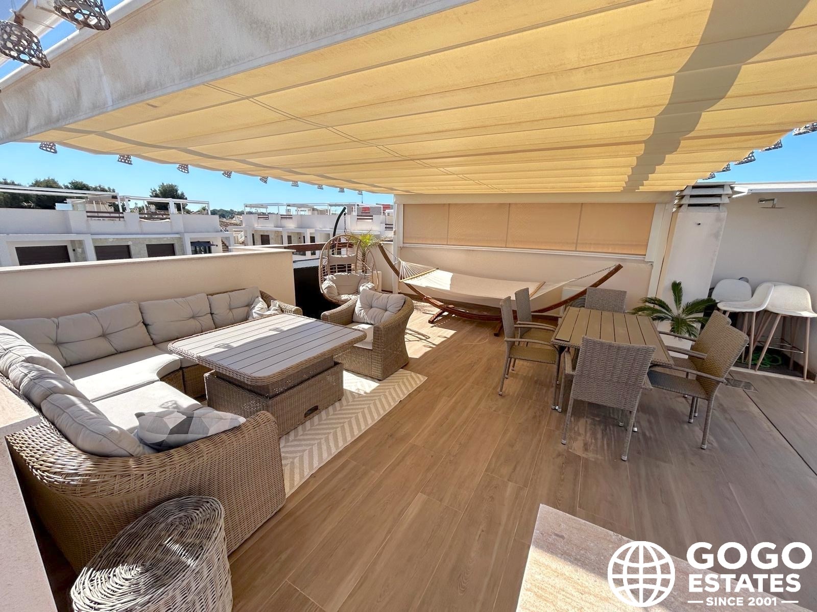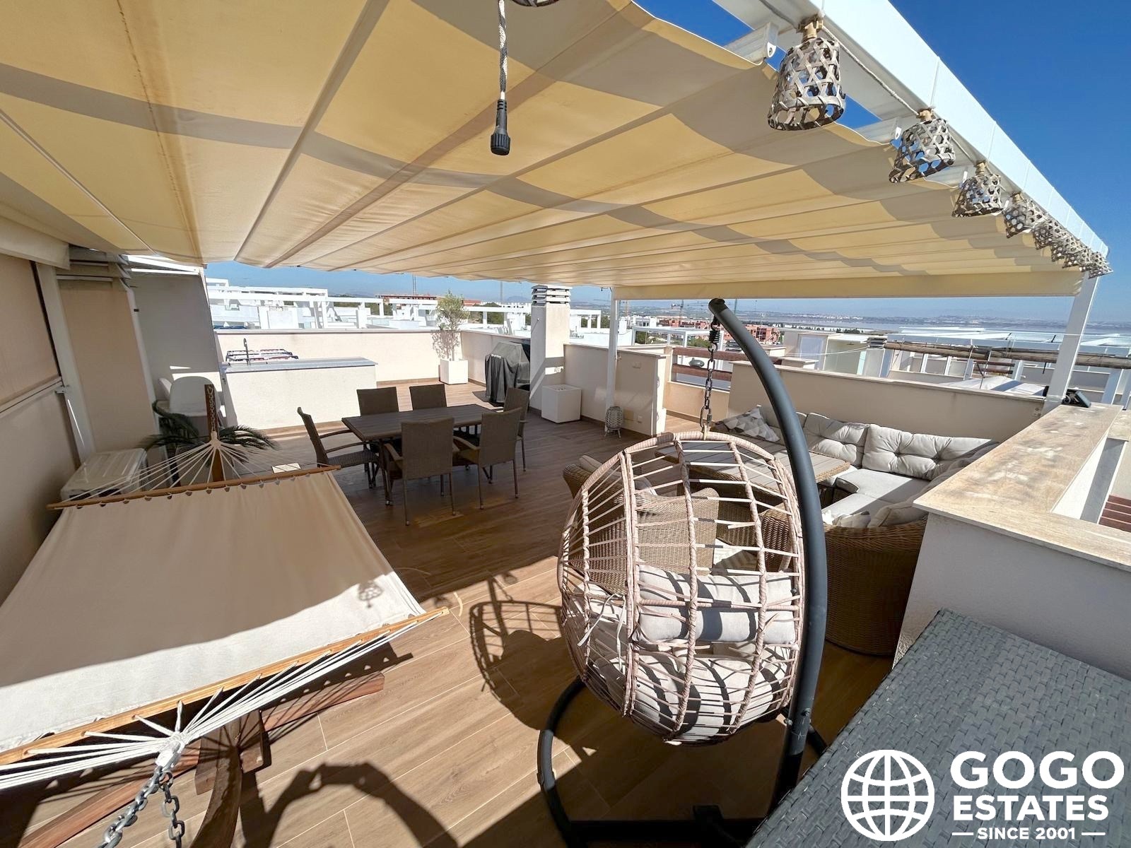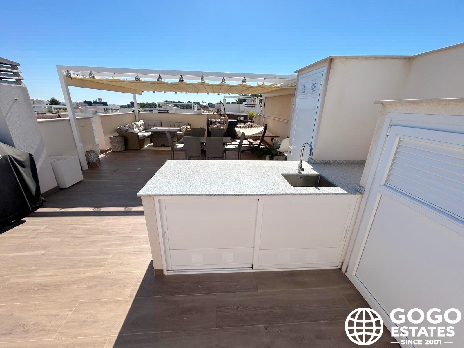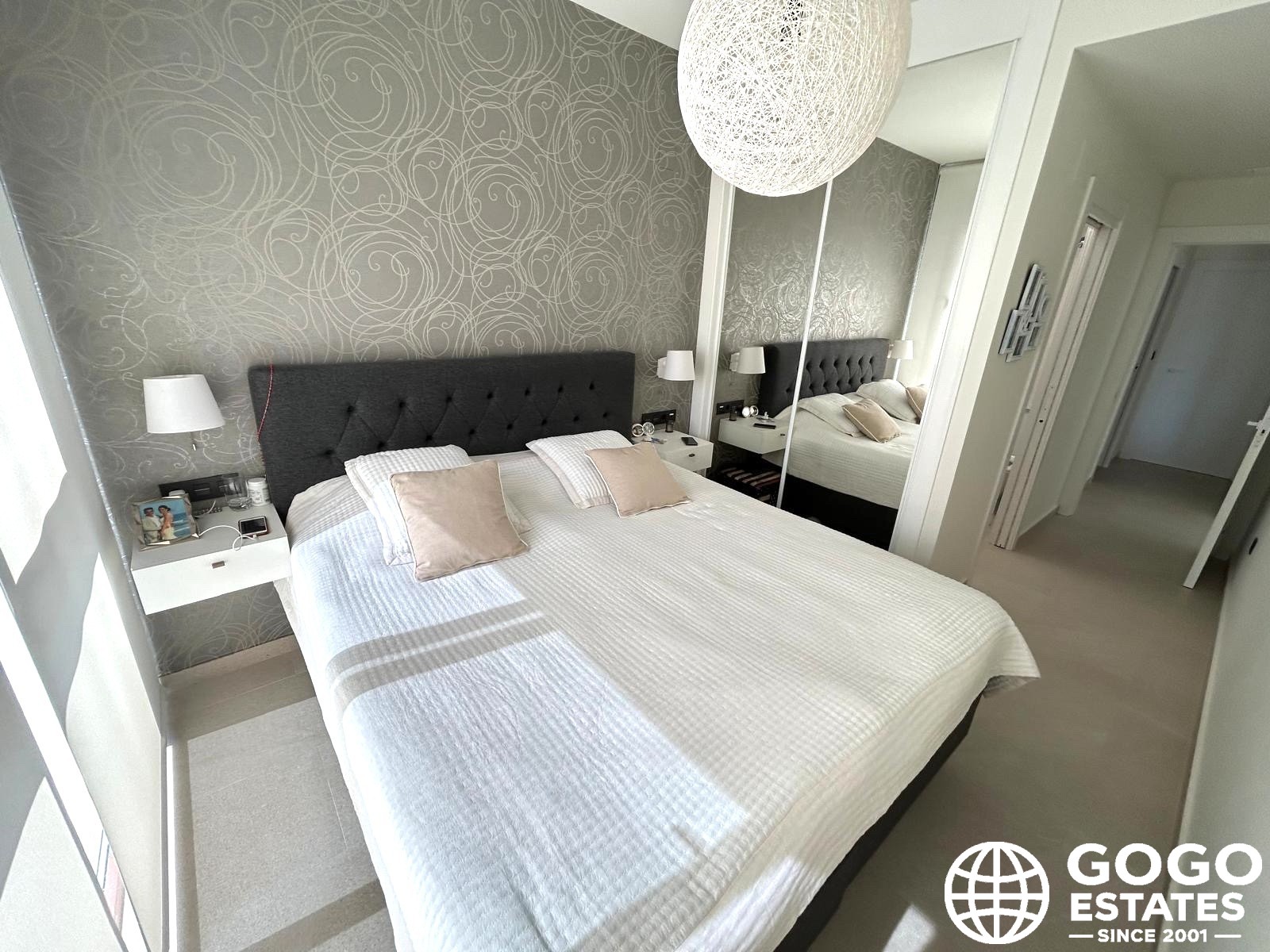 The private terrace, measuring 37 m², is ideal for outdoor relaxation and enjoying the Mediterranean views. High-quality finishes, including ceramic flooring and built-in wardrobes, enhance the elegance and functionality of the interior.