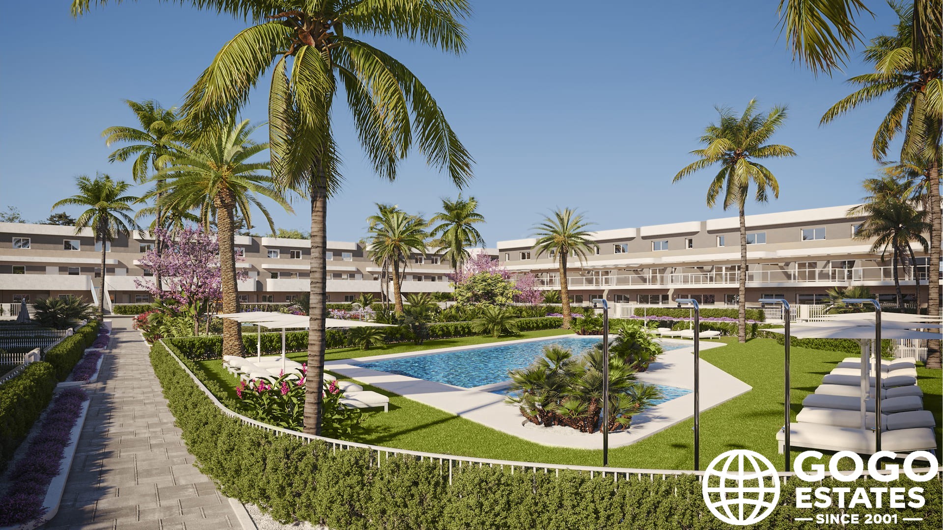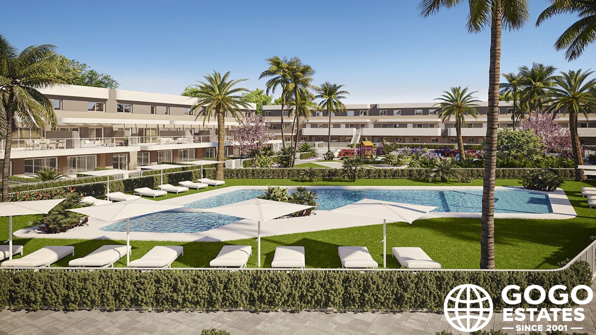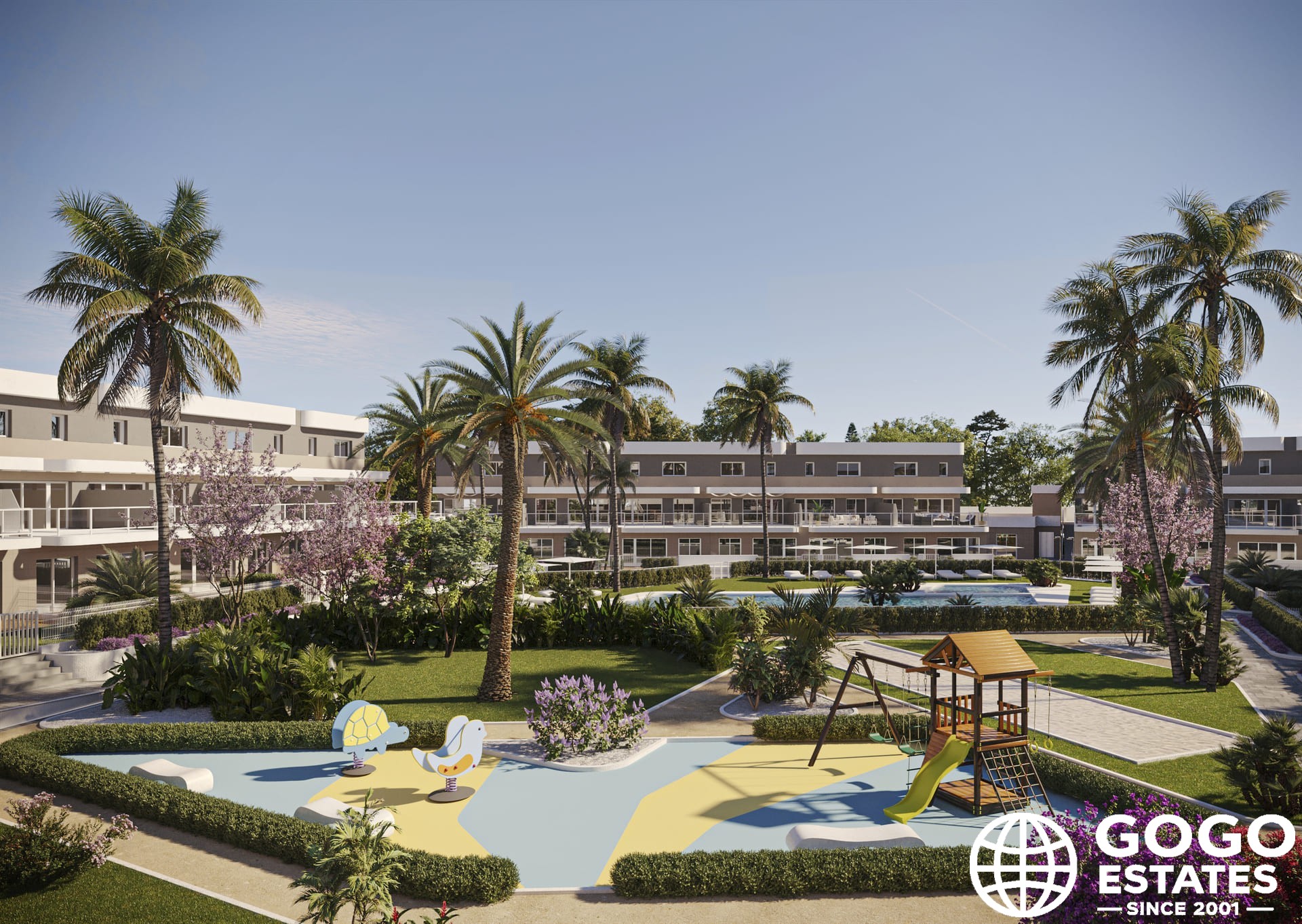 Outdoor areas include private gardens and terraces, perfect for enjoying the Mediterranean climate. The community features a communal solarium and landscaped areas, promoting a relaxing environment.