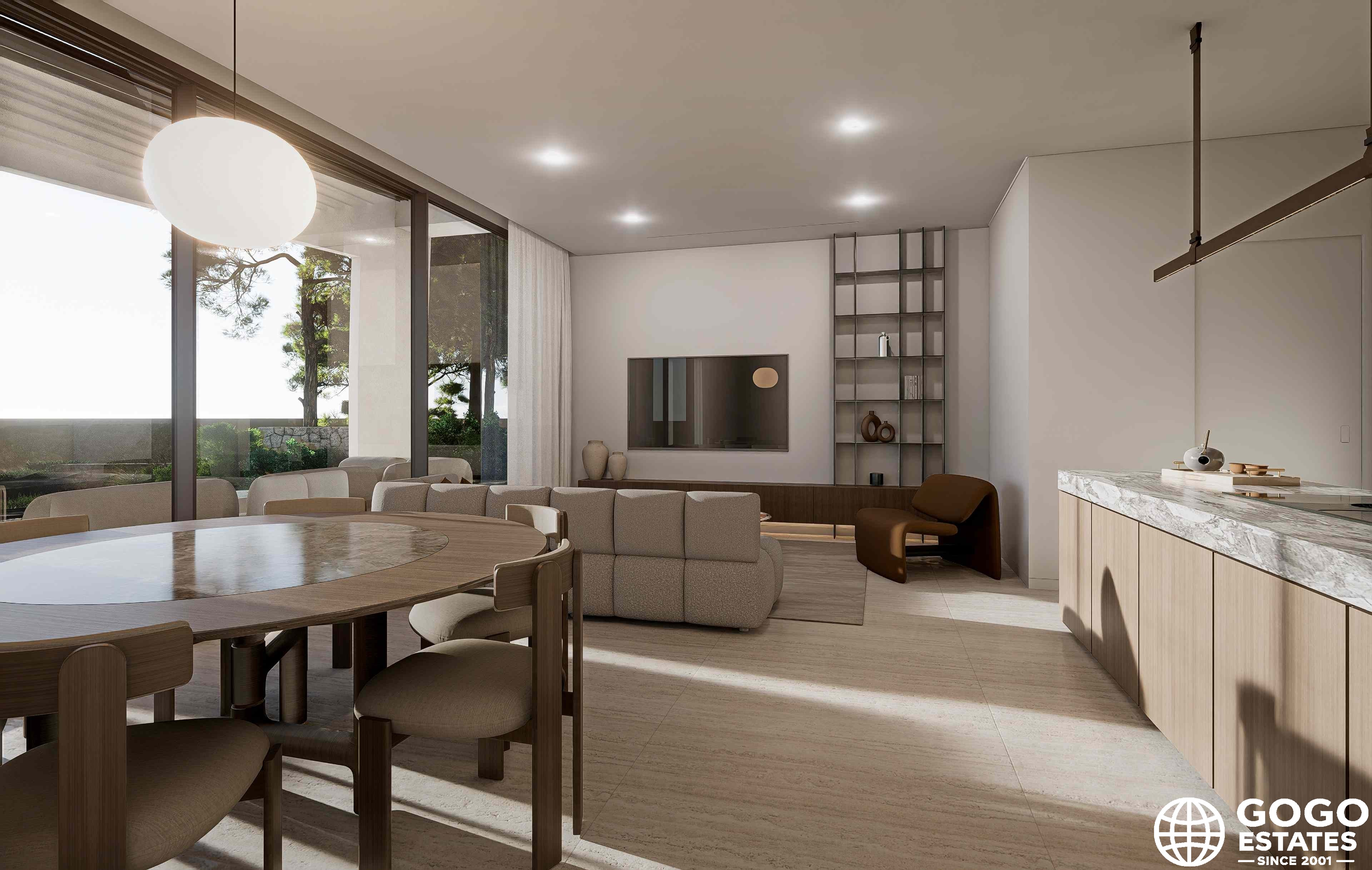 Inside, the villa is equipped with modern and high-quality features. Porcelain tile flooring adds elegance, while air conditioning ensures comfort year-round. Electric shutters, a video intercom, and a home automation system enhance convenience and security. The kitchen is equipped with all necessary appliances.