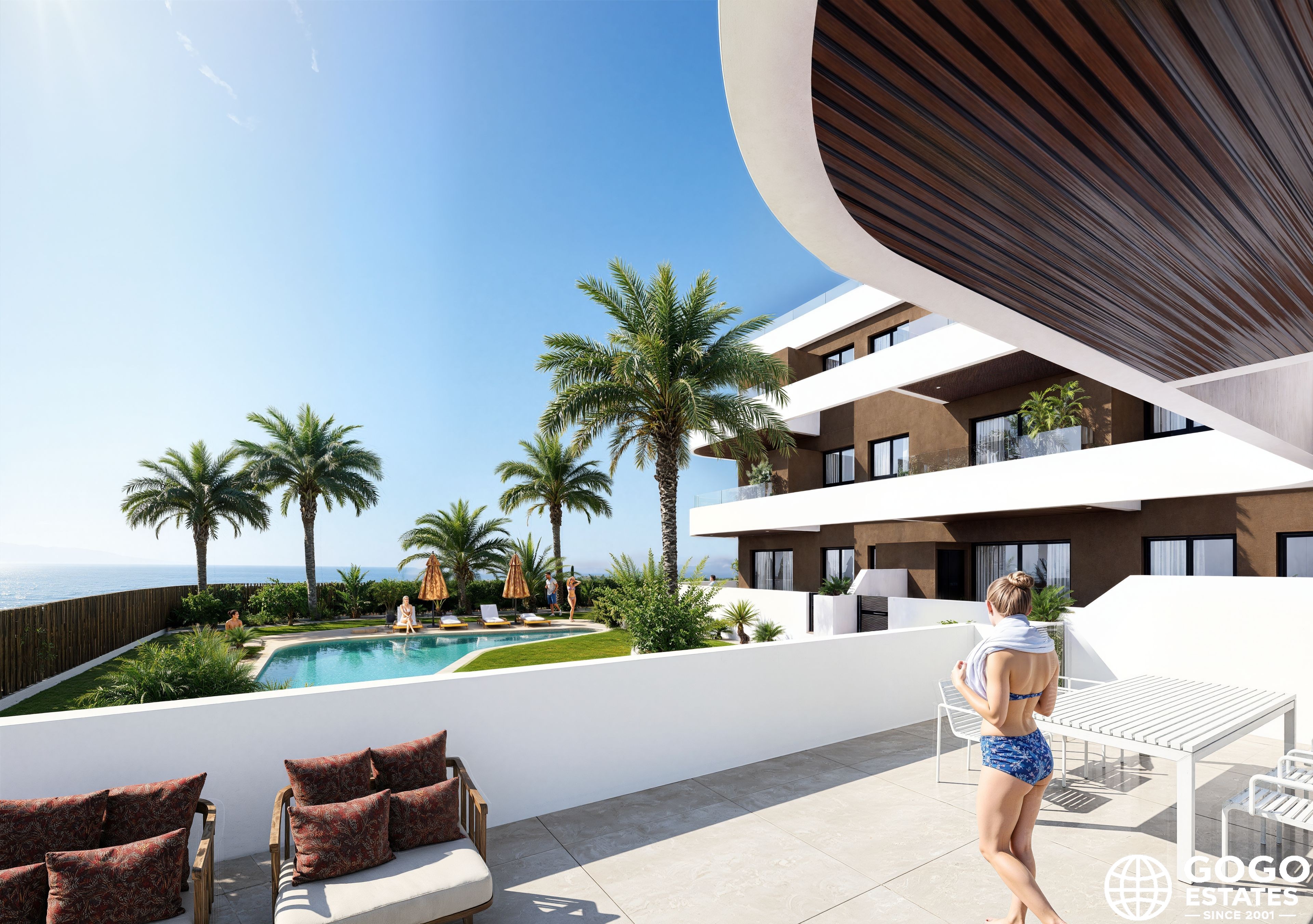 The outdoor areas are designed to offer a relaxed lifestyle in contact with nature. The properties feature terraces that allow for enjoying the sea views and the Mediterranean climate. Some types include a solarium, providing additional outdoor space for leisure and relaxation.