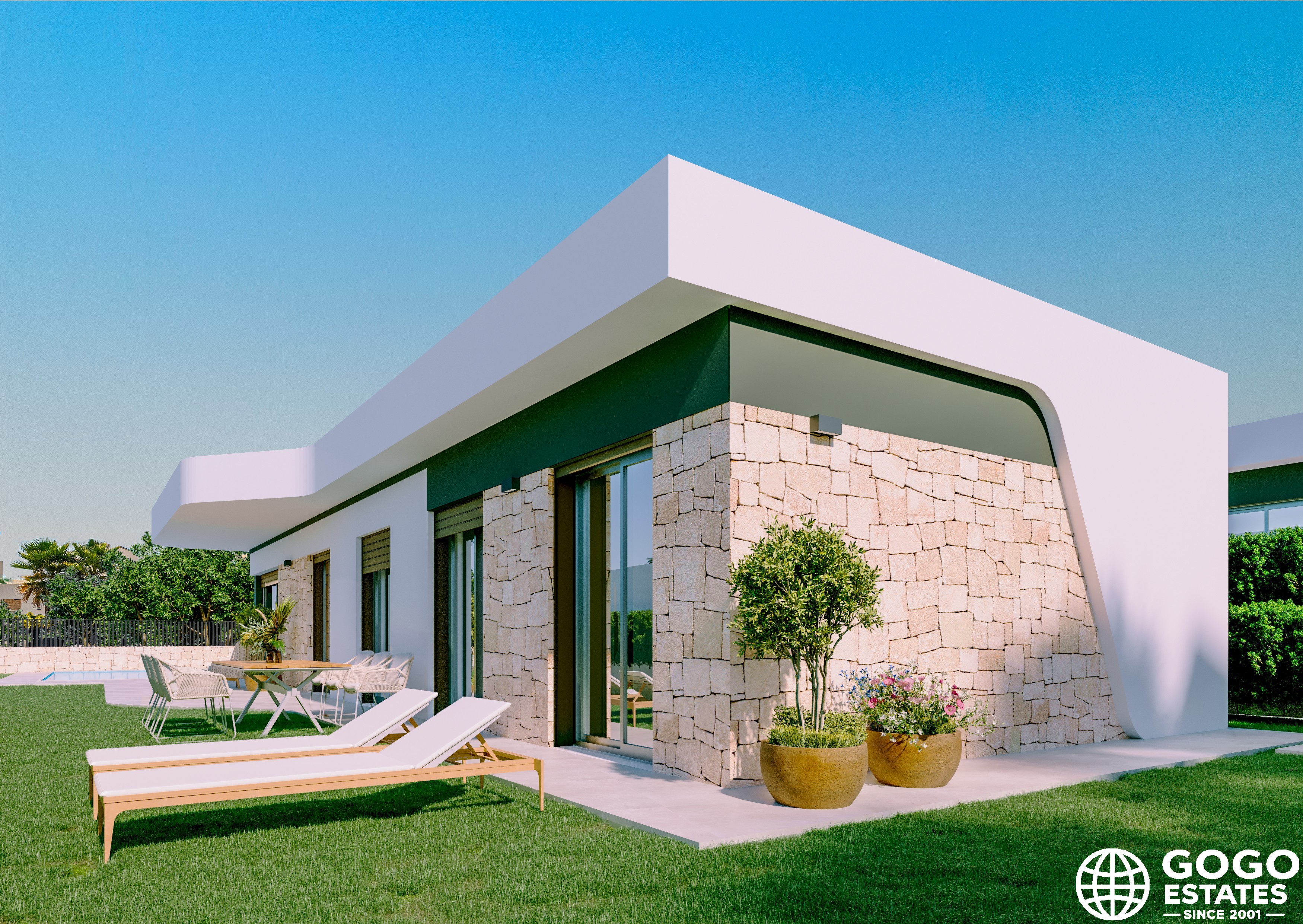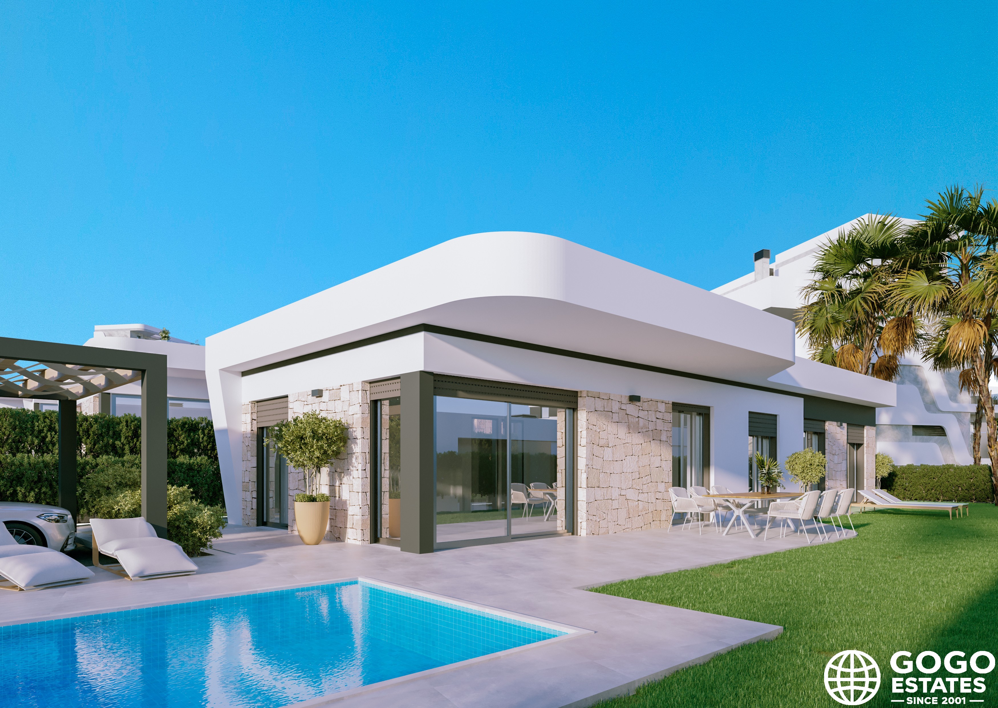 The exteriors are designed to fully enjoy the Mediterranean climate. Each property features a private garden, terrace, and a pool, perfect for outdoor relaxation and entertainment. A pergola adds elegance and functionality, providing shade and additional outdoor space.