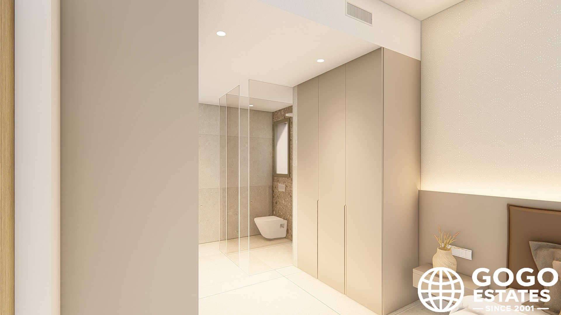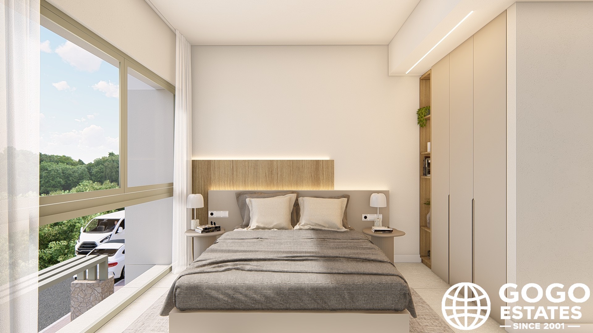 Inside, porcelain tile floors and air conditioning ensure comfort. The kitchen is equipped with modern appliances, and built-in wardrobes offer ample storage.