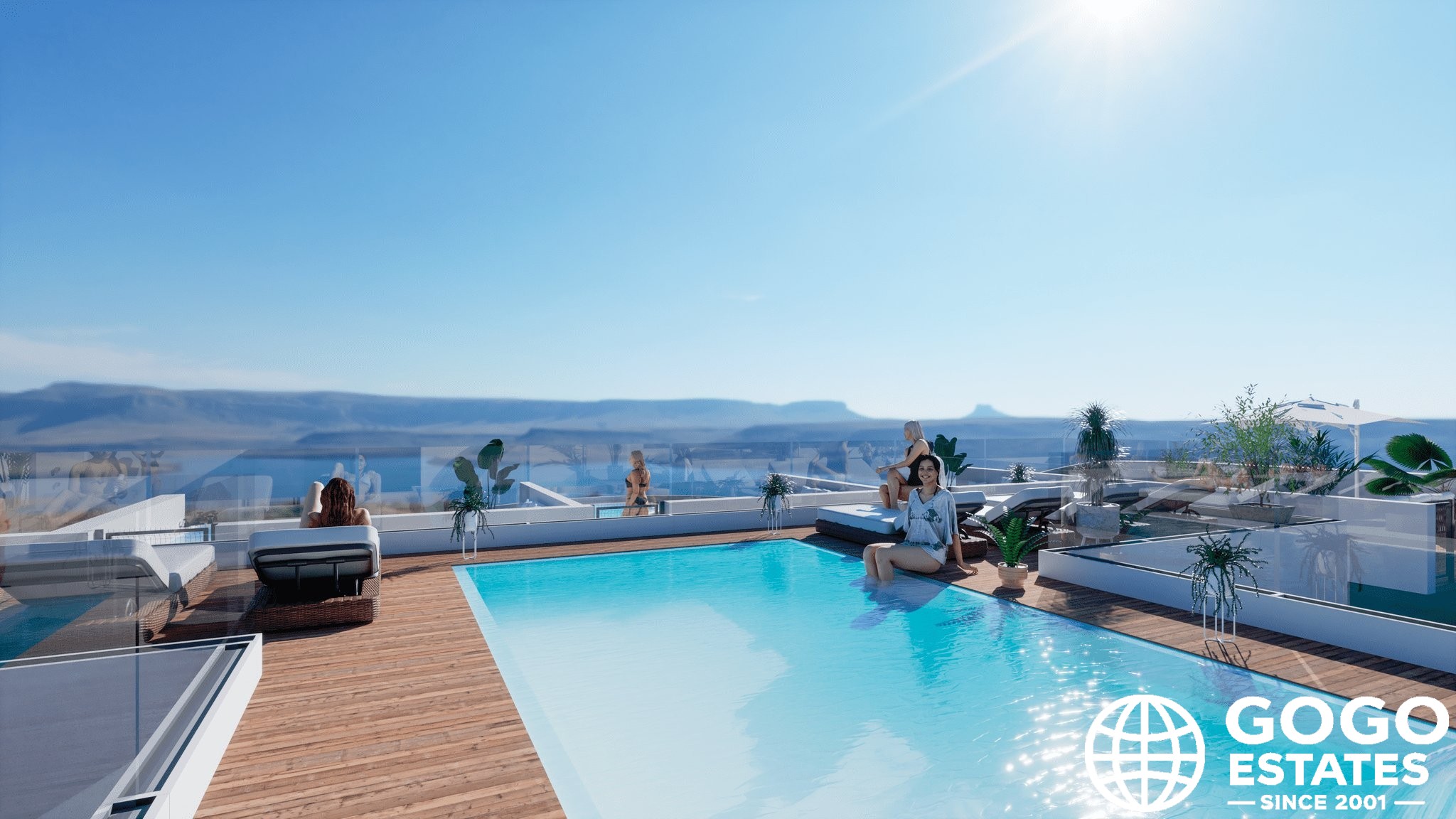 The exteriors of this complex are designed to complement the natural surroundings and offer a space for relaxation. Private terraces in each property provide sea views and a place to enjoy the Mediterranean climate year-round. Additionally, the community features extensive garden areas, perfect for leisurely walks or outdoor activities.