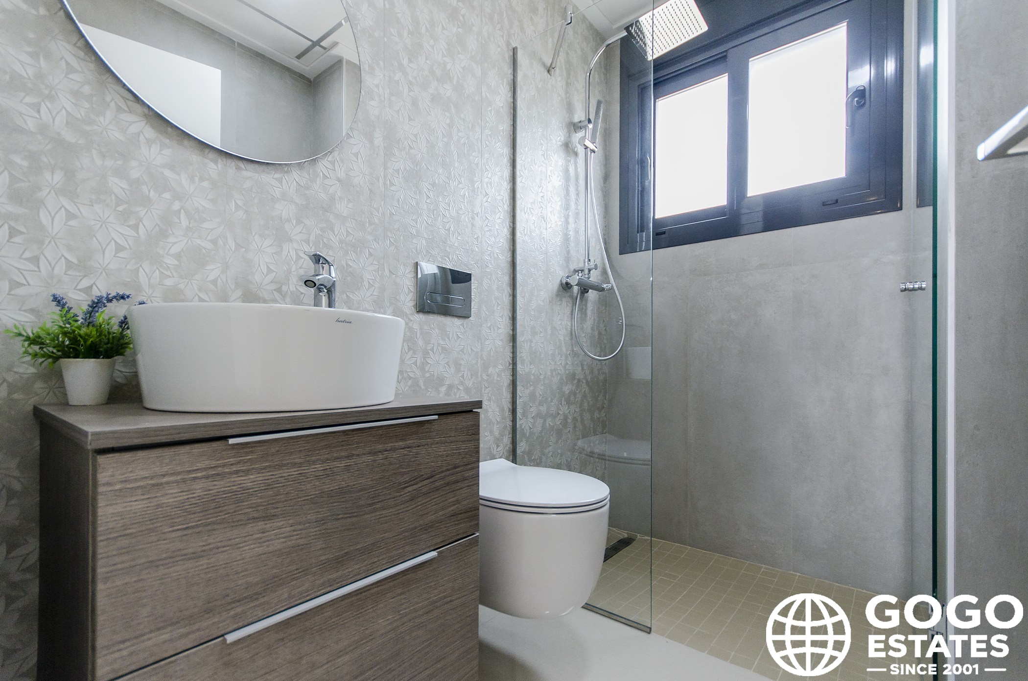Indoors, the villa focuses on comfort and functionality. Ceramic floors, air conditioning, and a fully equipped kitchen enhance daily living. Built-in wardrobes offer ample storage, and a video intercom adds security.