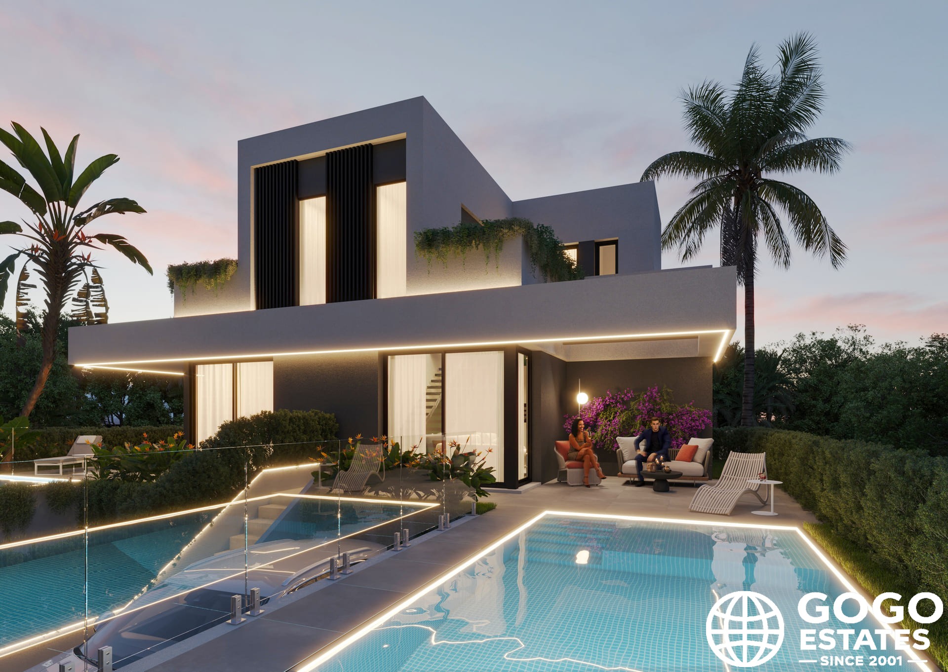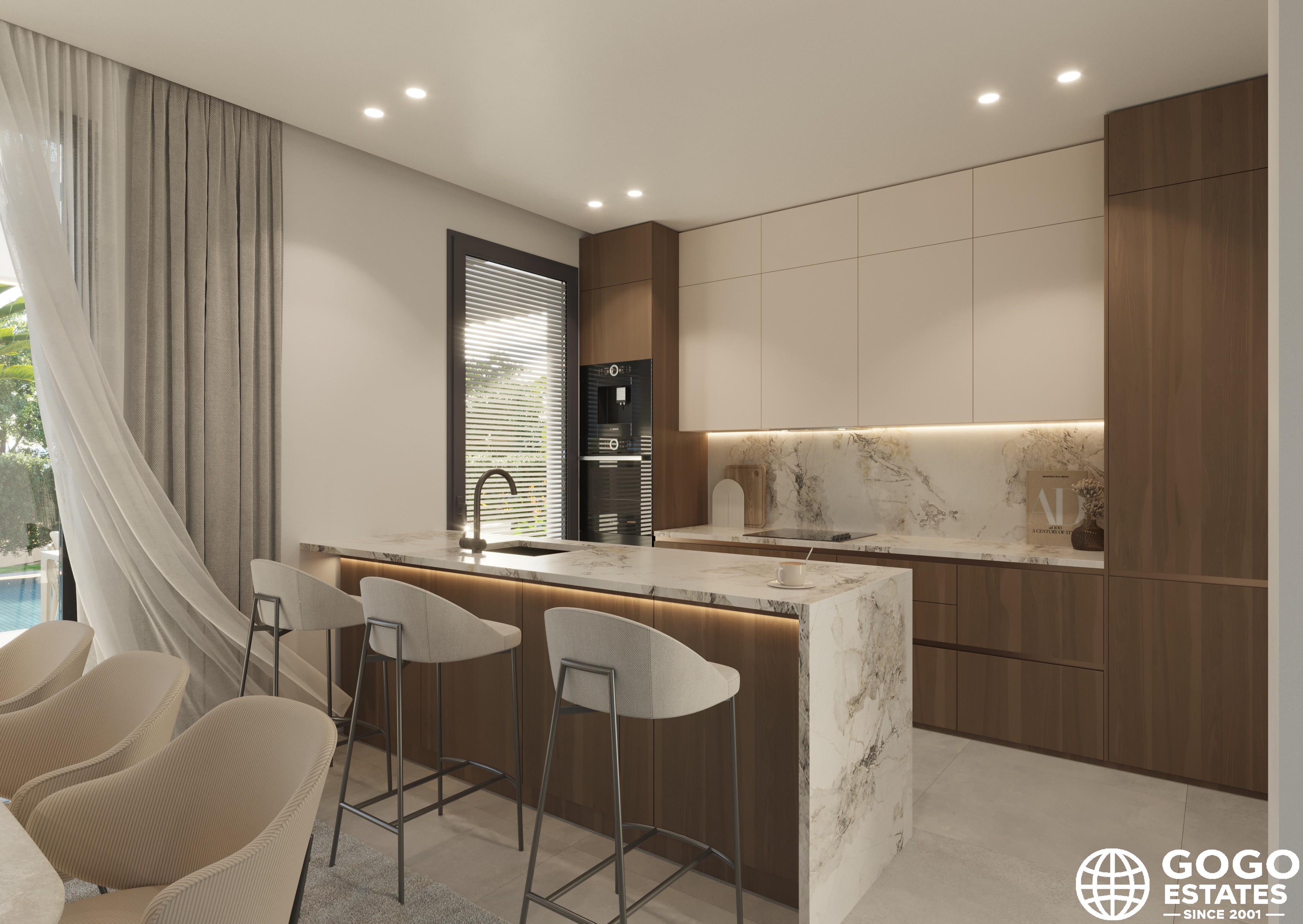 Inside, the villa combines modern design with functionality. The fully furnished kitchen is equipped with high-end appliances and integrates seamlessly into the living space. Comfort is ensured with features like air conditioning, home automation, and underfloor heating in the bathrooms.