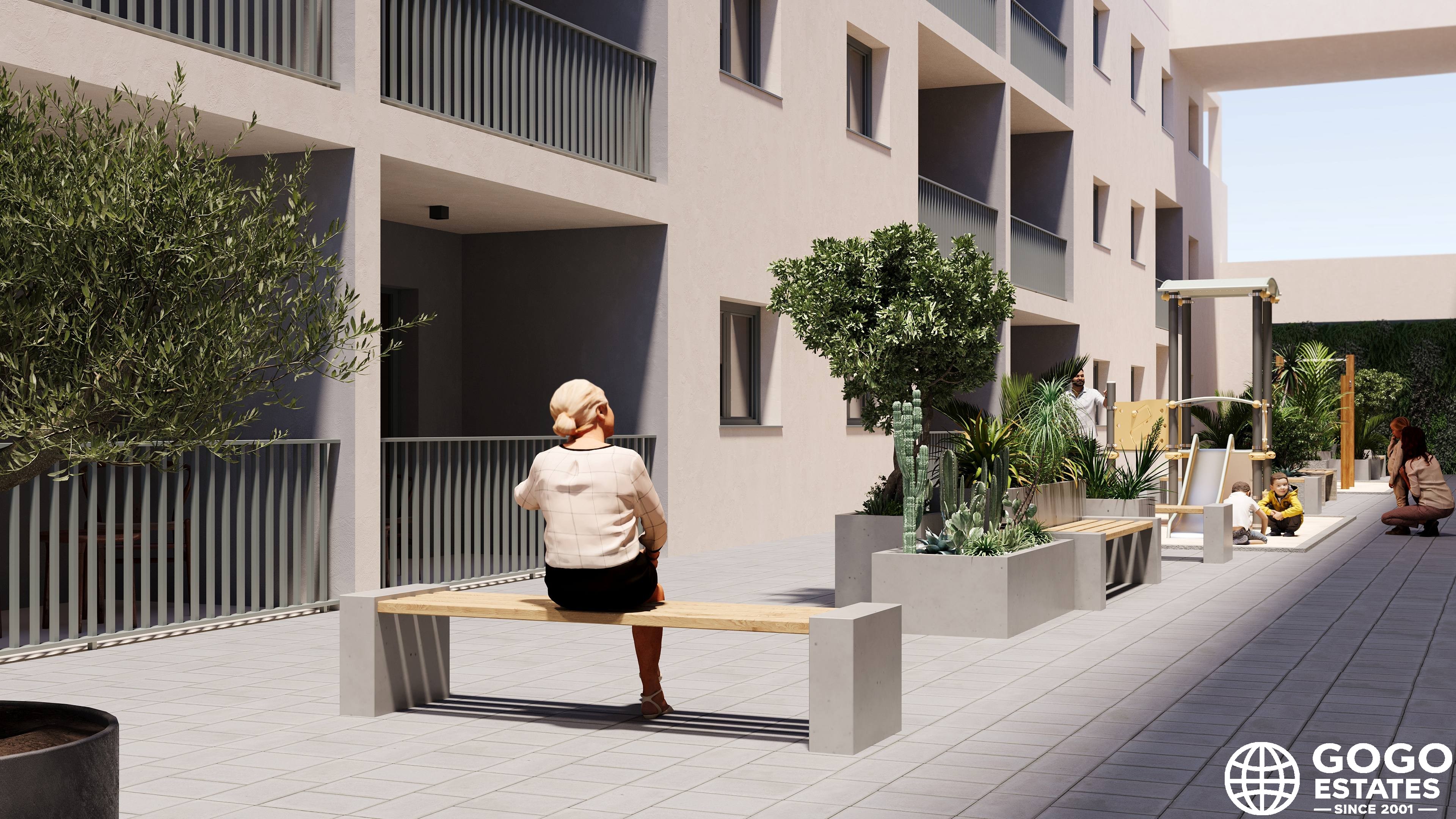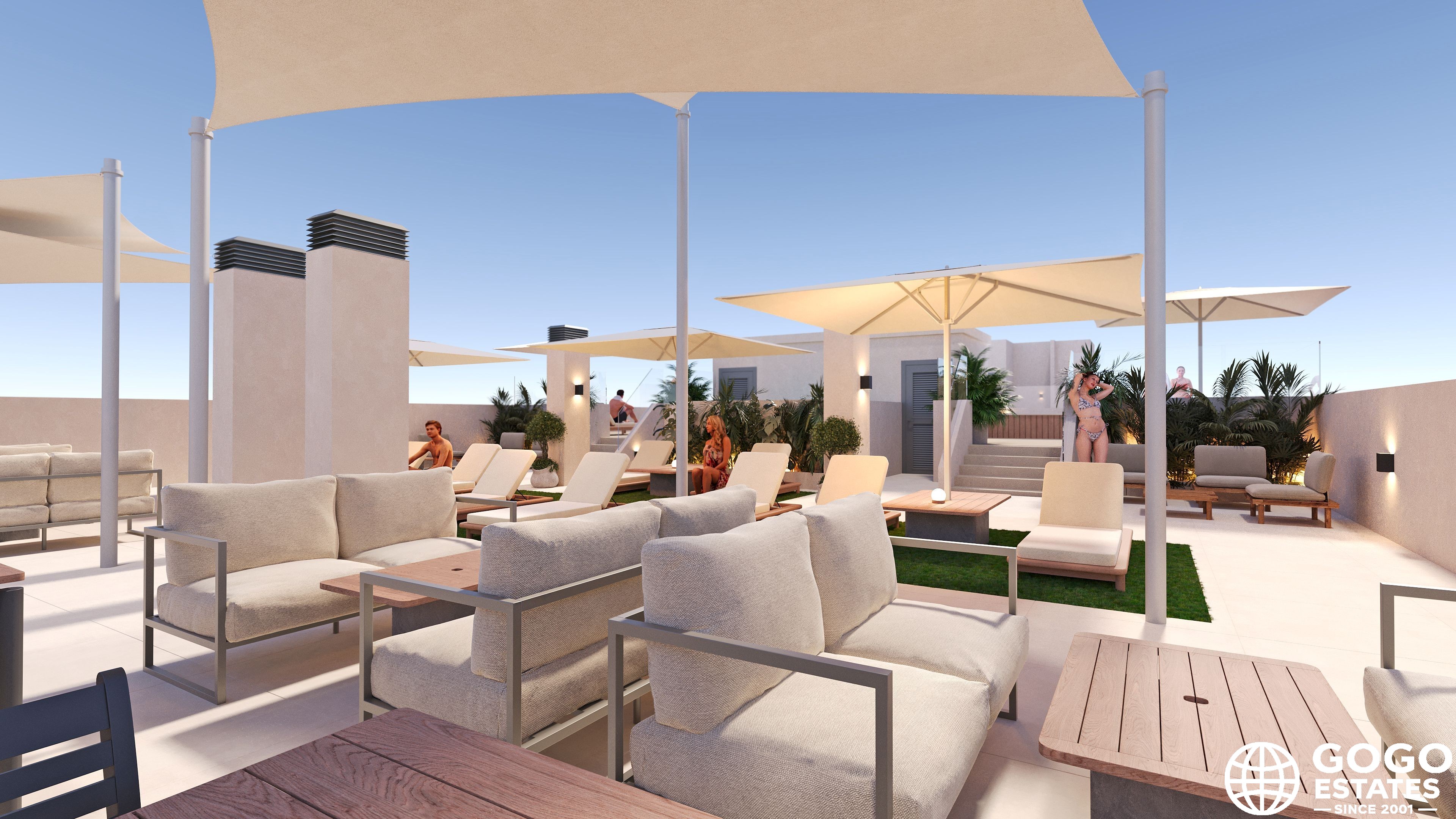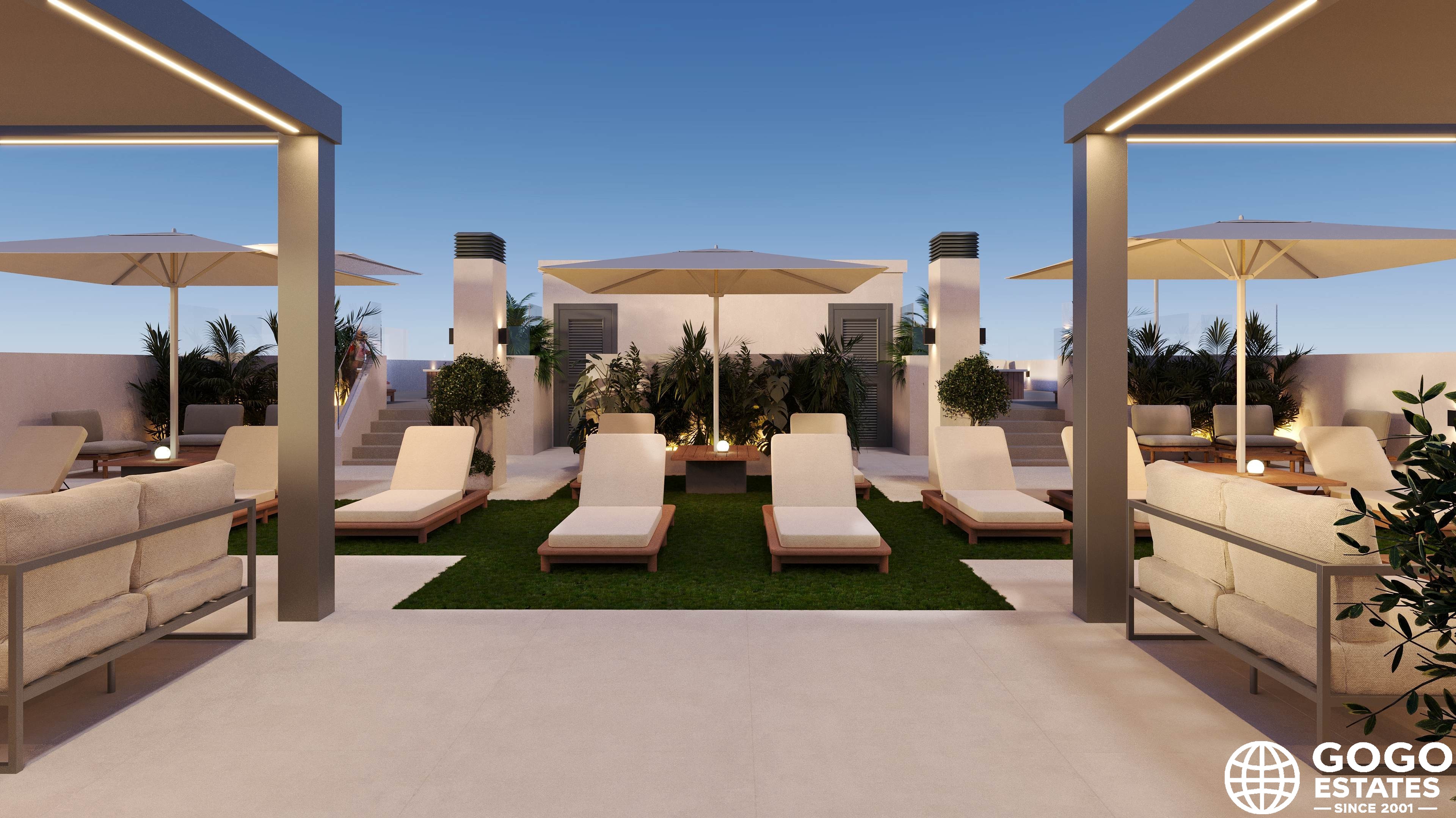 Residents can enjoy spacious terraces, perfect for relaxing outdoors and enjoying the Mediterranean climate. The landscaped areas offer a green space to stroll or enjoy the tranquility. Additionally, the community features a communal solarium and pool, ideal for sunbathing and enjoying panoramic views.
