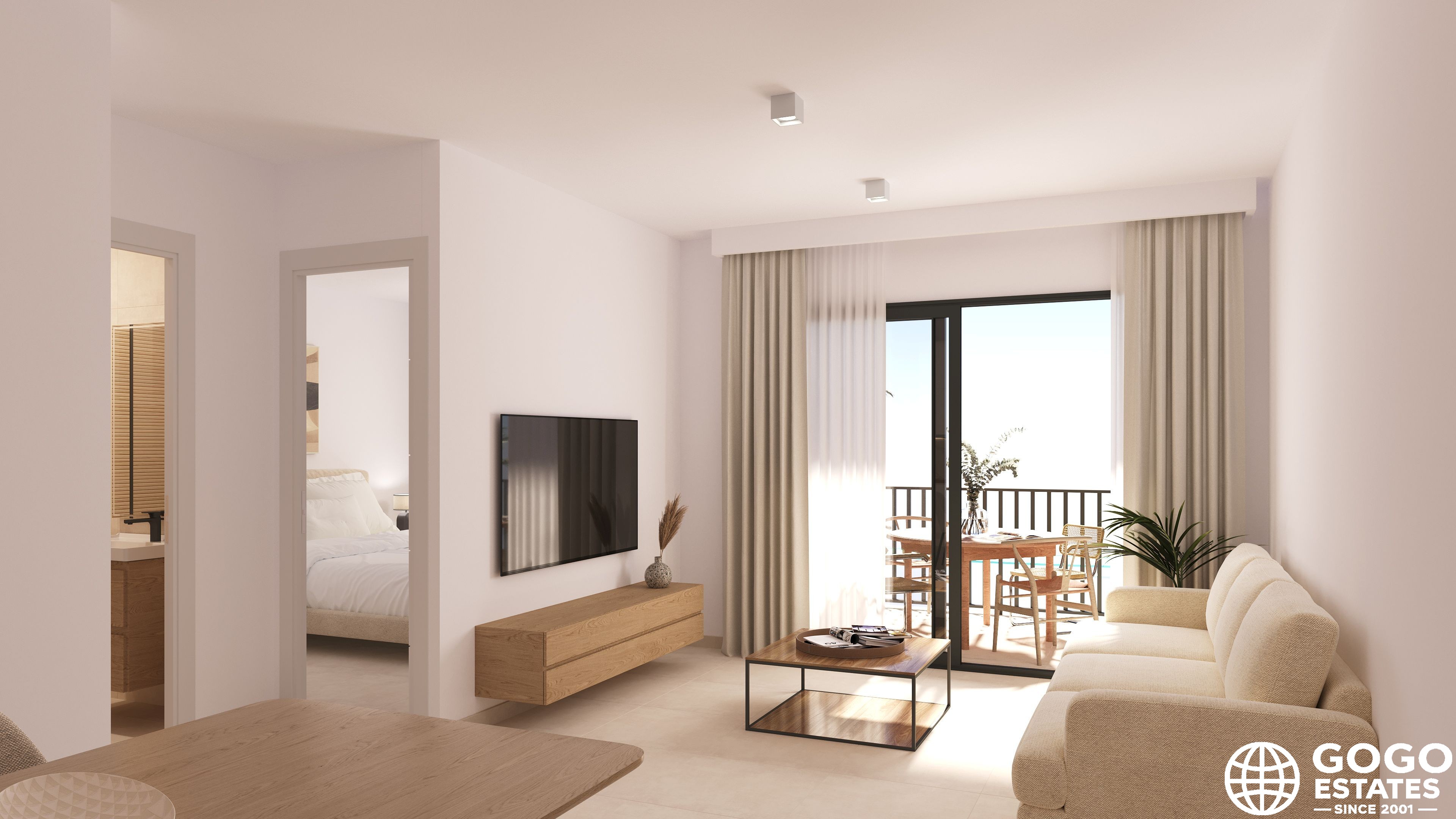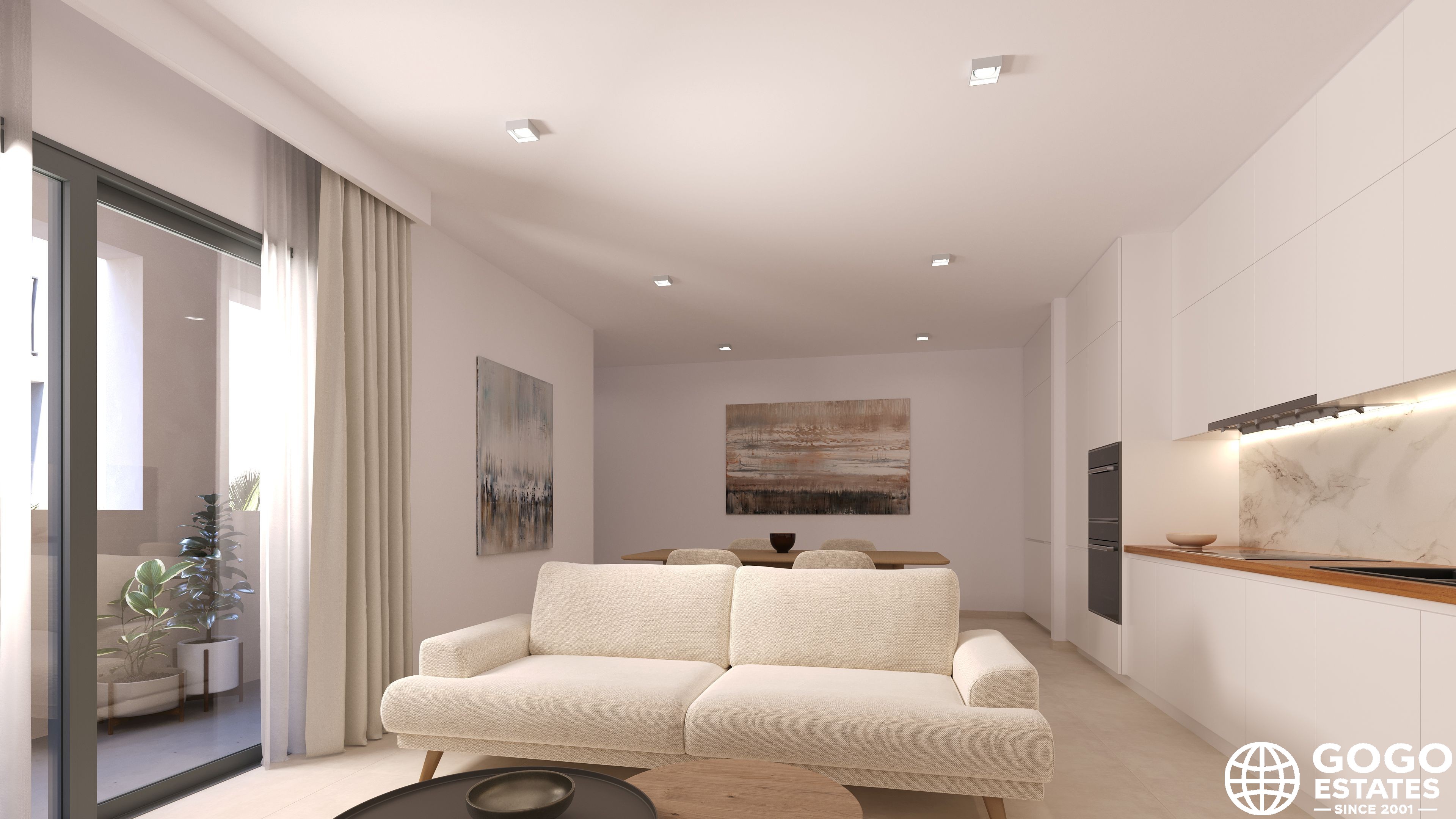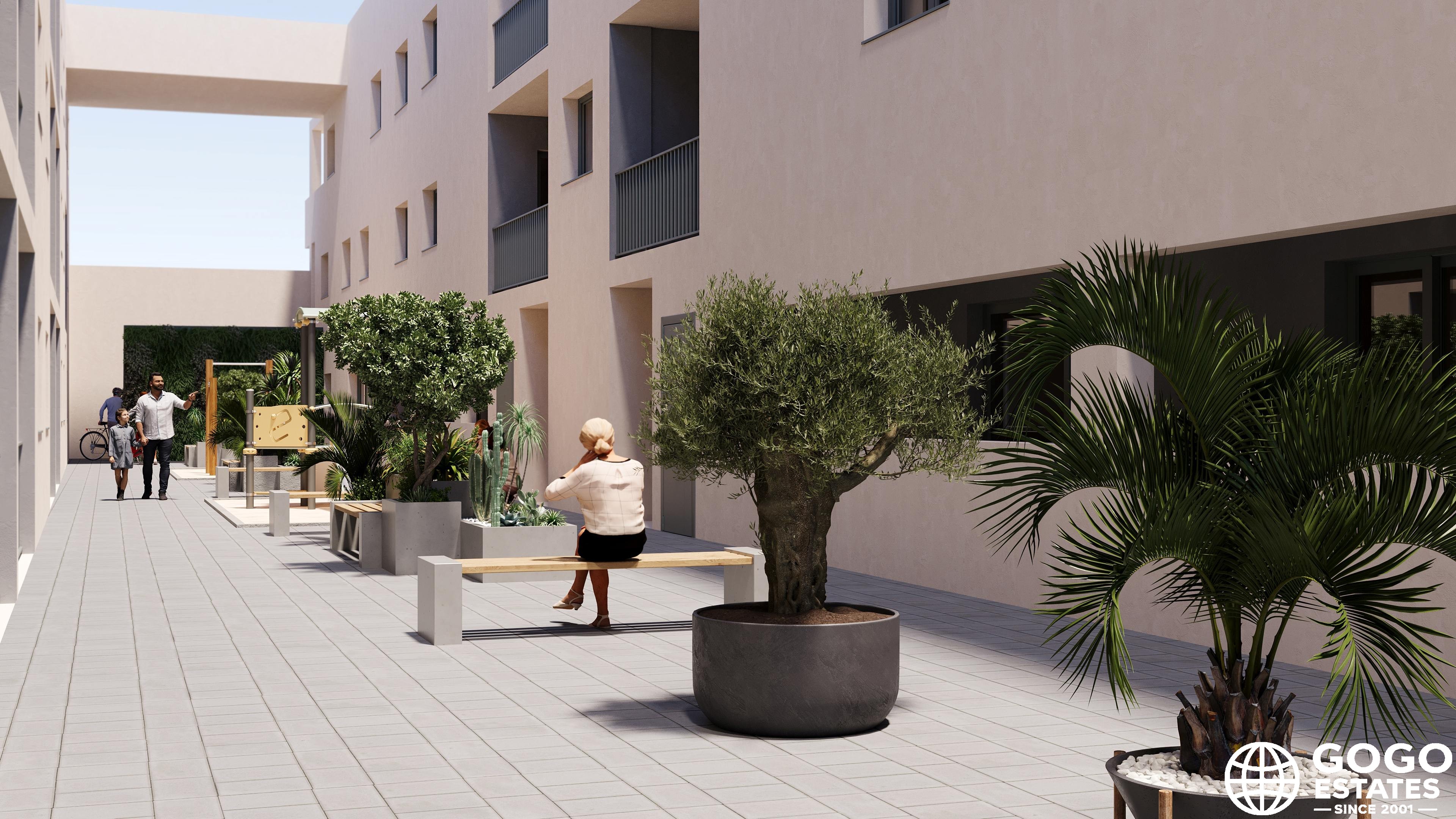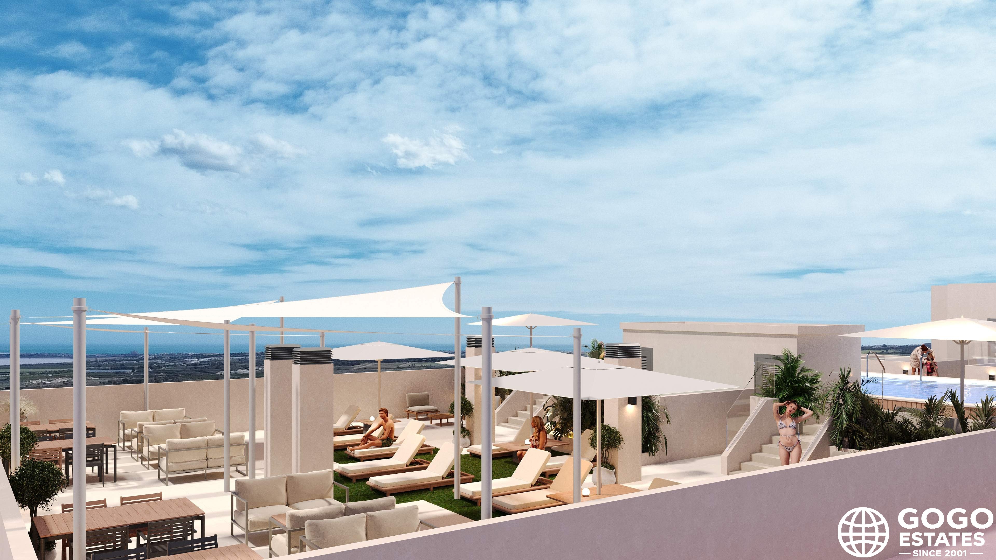 Residents can enjoy spacious terraces, perfect for relaxing outdoors and enjoying the Mediterranean climate. The landscaped areas offer a green space to stroll or enjoy the tranquility. Additionally, the community features a communal solarium and pool, ideal for sunbathing and enjoying panoramic views.