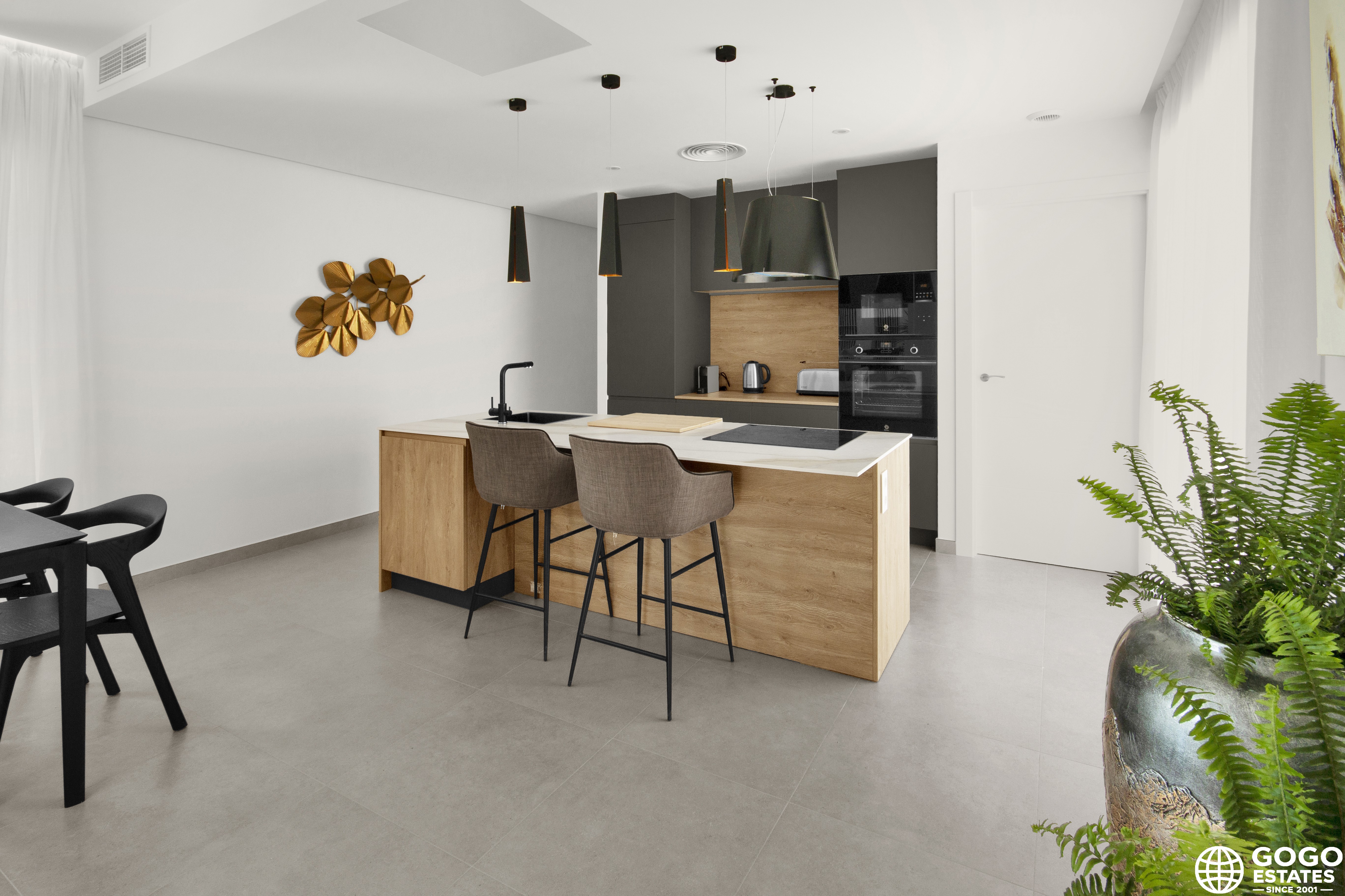 Inside, the homes boast porcelain stoneware floors and an air conditioning system for year-round comfort. Built-in wardrobes provide practical storage, and the modern kitchen is designed for convenience. A private garage offers secure parking.